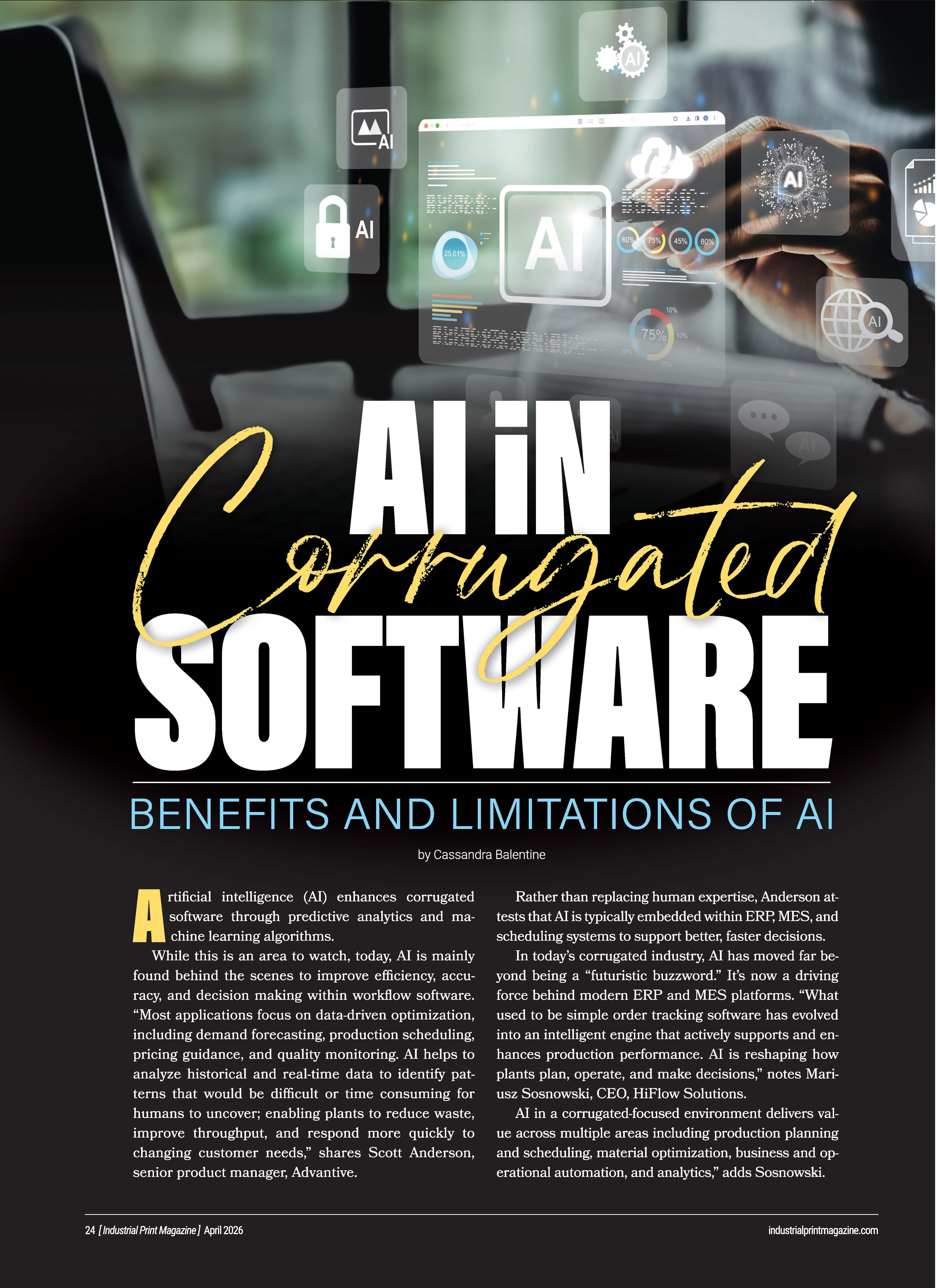 Take for example artificial intelligence's (Al's) use in software. The technology improves efficiency, accuracy, and decision makingthanks to predictive analytics and machine learning algorithms. This issue includes an article on Al and its particular use in corrugated software solutions, specifically areas like production planning and scheduling as well as data reporting and analytics.