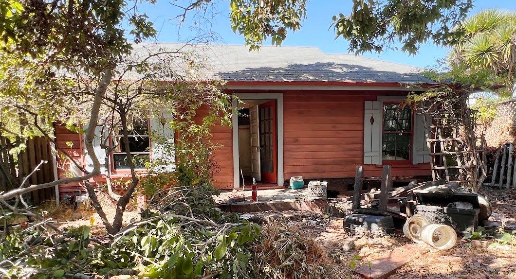 Standing in the yard, the cabin felt small in a way that has nothing to do with neglect or the larger Craftsman-era homes and newer multi-story rebuilds that surround it. Built from coastal redwood, the workhorse material of early Bay Area houses, it was made for a different moment and never asked to be more than that.