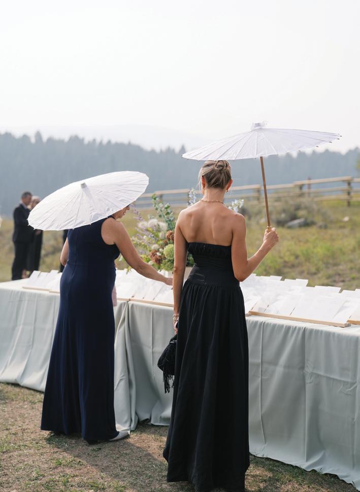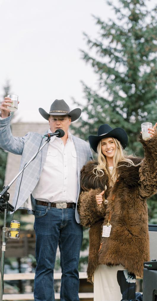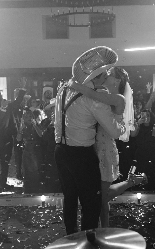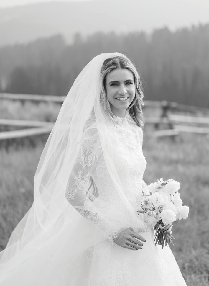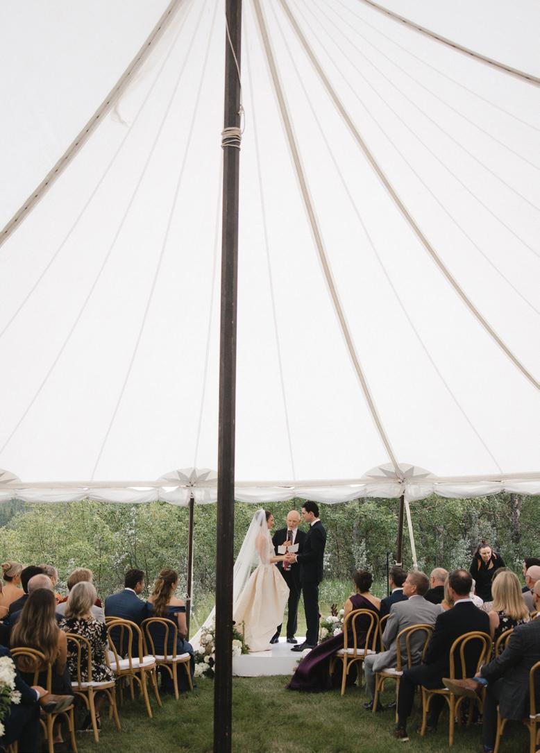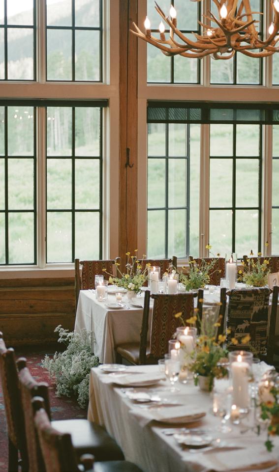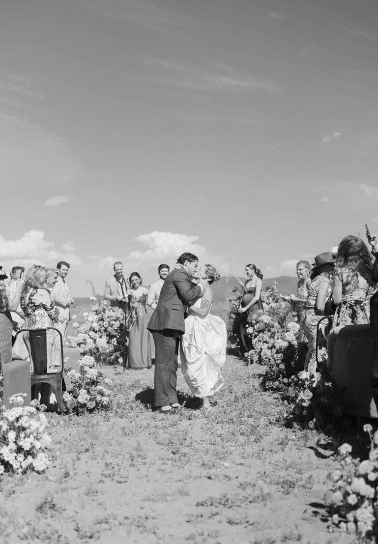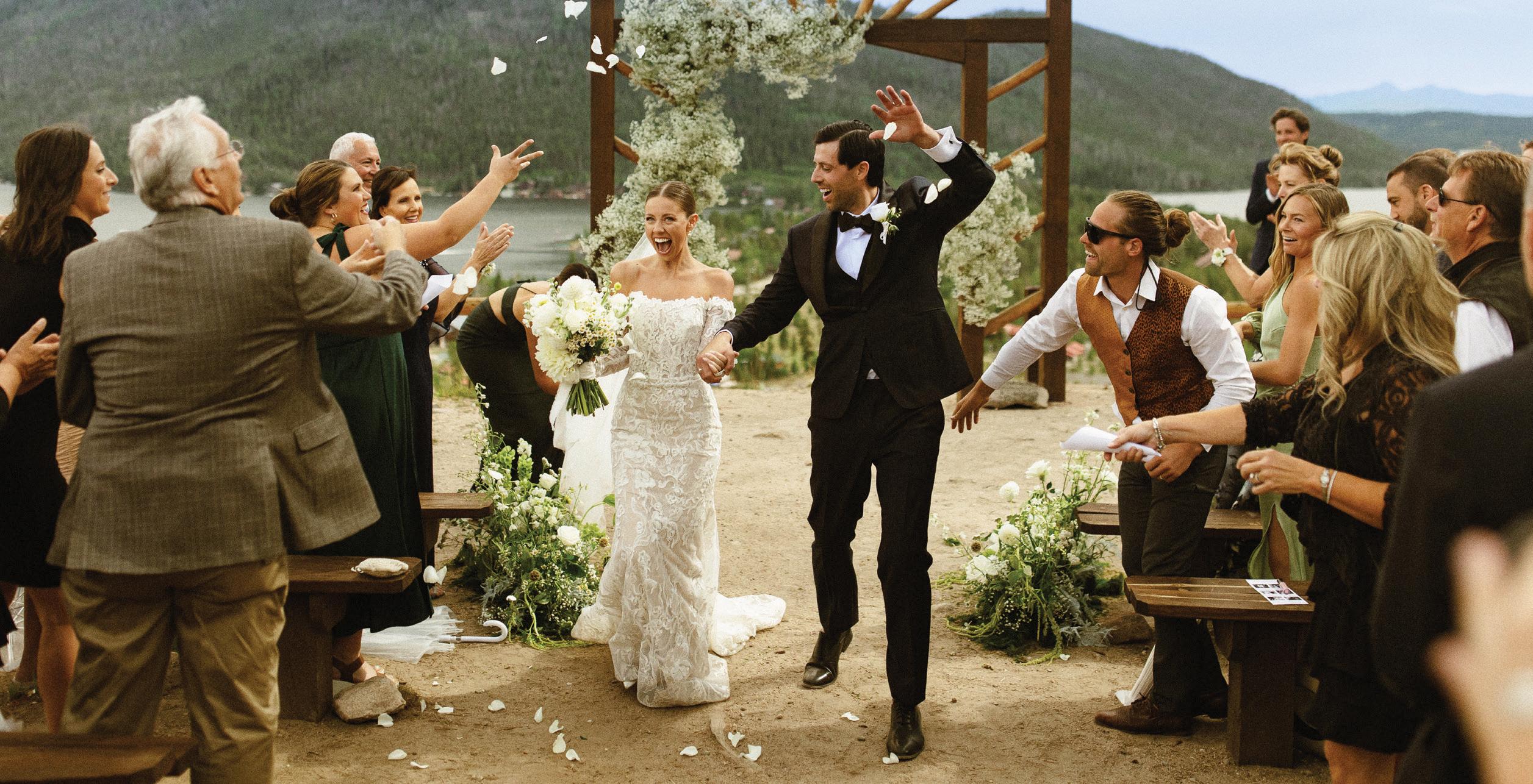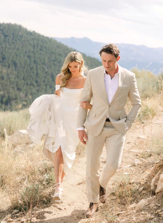 Makenzie and Alex planned a cozy, cabininspired wedding with Ralph Lauren flair for 90 guests at Beano’s Cabin. Opting not to do a first look, Alex first saw his bride in a stunning Dana Harel gown as she walked down the aisle toward the sweeping peaks of the Rockies, her cathedrallength veil drifting in the wind. For the reception, pops of yellow wildflowers and the glow of candlelight accented the tables, adding to the intimate, familydinner atmosphere that ended up being the couple’s favorite part of the day.. Looking back, Makenzie shared, “Once the dance floor opened, it never stopped; friends on shoulders, spins straight out of Blades of Glory and even a few ripped suit pants. We felt endlessly celebrated and so loved.”