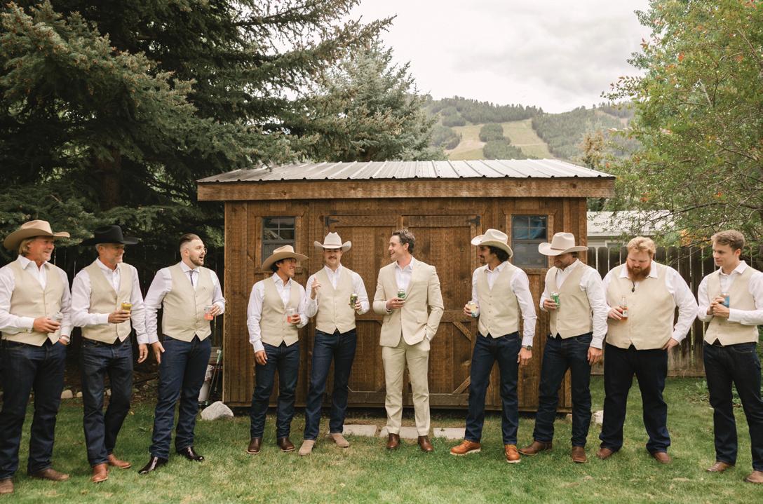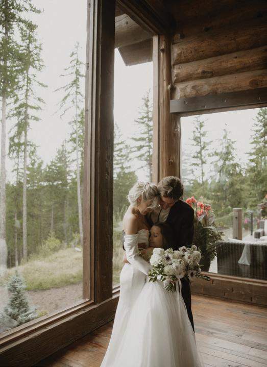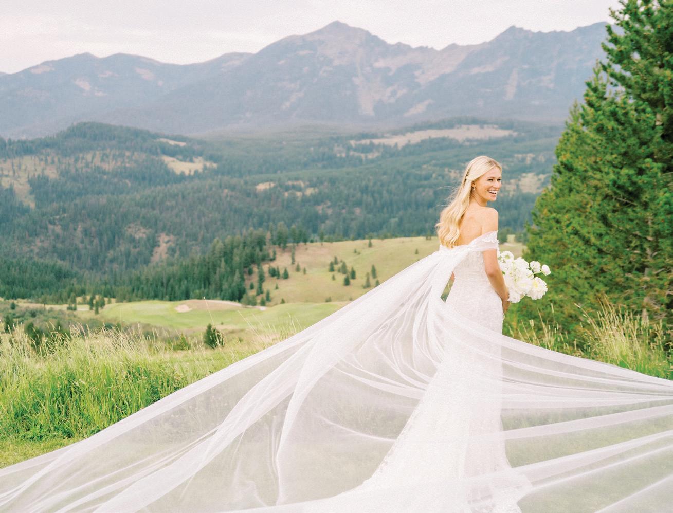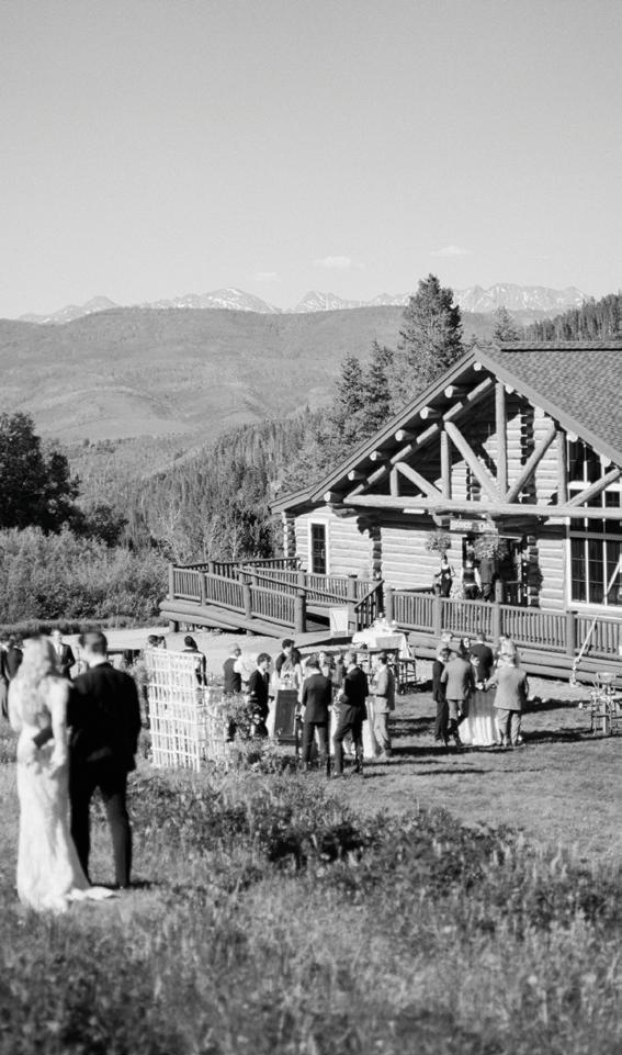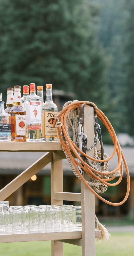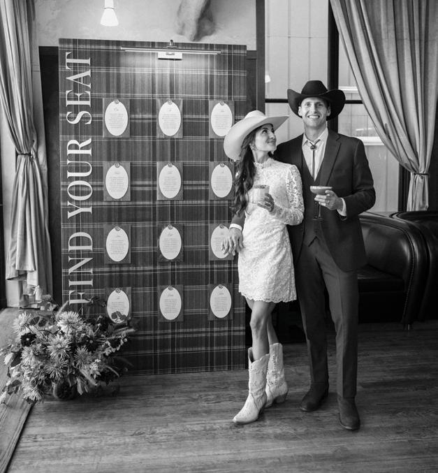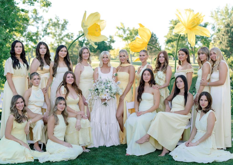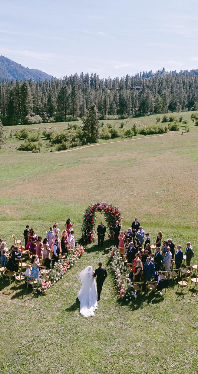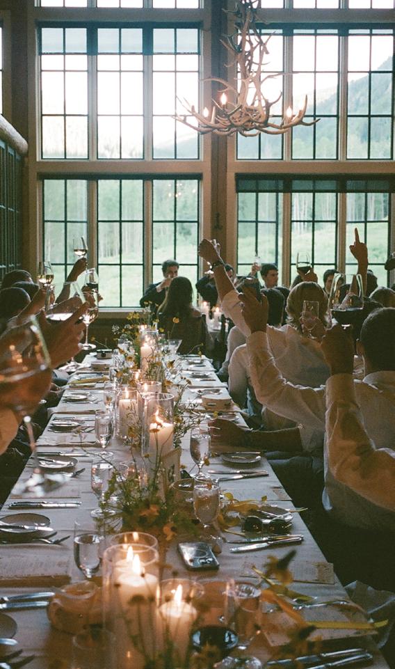 Makenzie and Alex planned a cozy, cabininspired wedding with Ralph Lauren flair for 90 guests at Beano’s Cabin. Opting not to do a first look, Alex first saw his bride in a stunning Dana Harel gown as she walked down the aisle toward the sweeping peaks of the Rockies, her cathedrallength veil drifting in the wind. For the reception, pops of yellow wildflowers and the glow of candlelight accented the tables, adding to the intimate, familydinner atmosphere that ended up being the couple’s favorite part of the day.. Looking back, Makenzie shared, “Once the dance floor opened, it never stopped; friends on shoulders, spins straight out of Blades of Glory and even a few ripped suit pants. We felt endlessly celebrated and so loved.”
