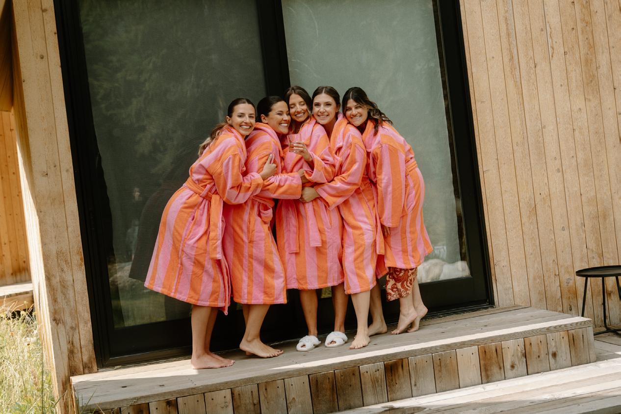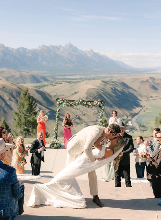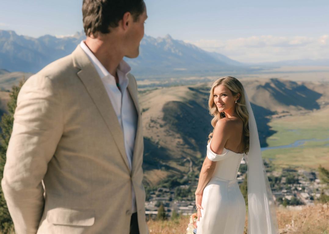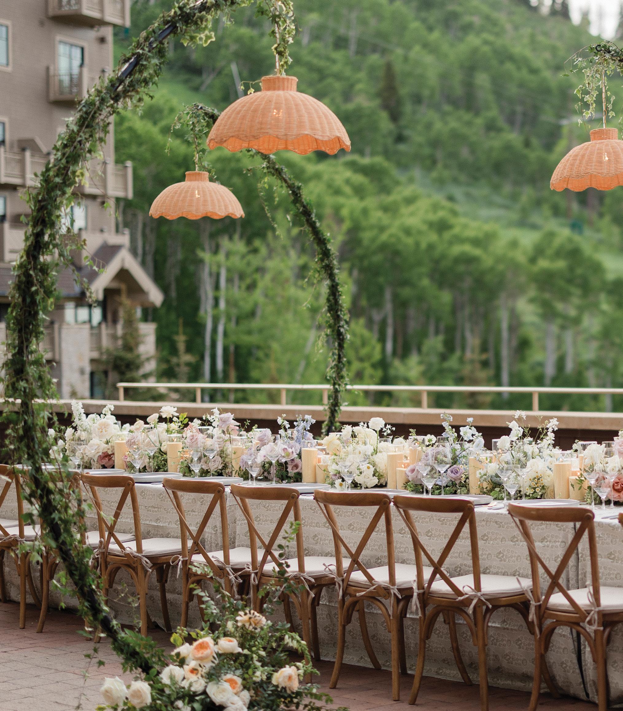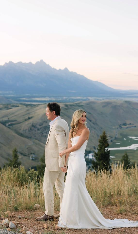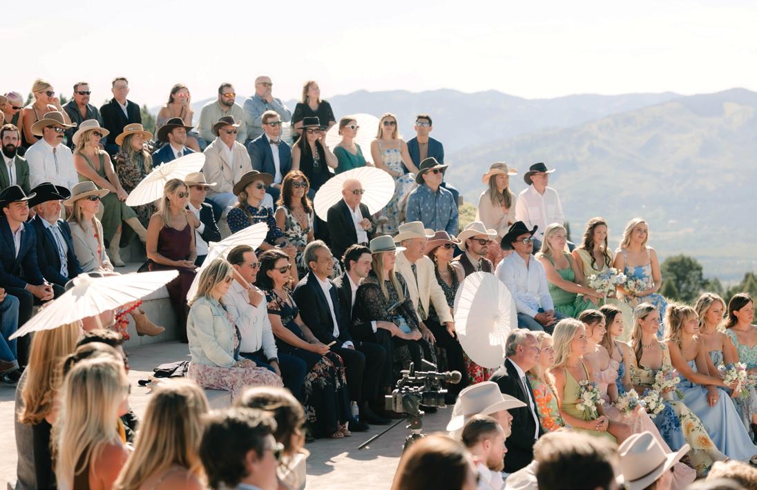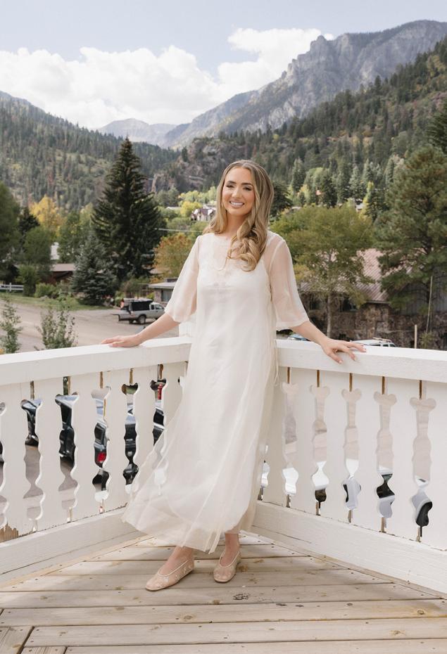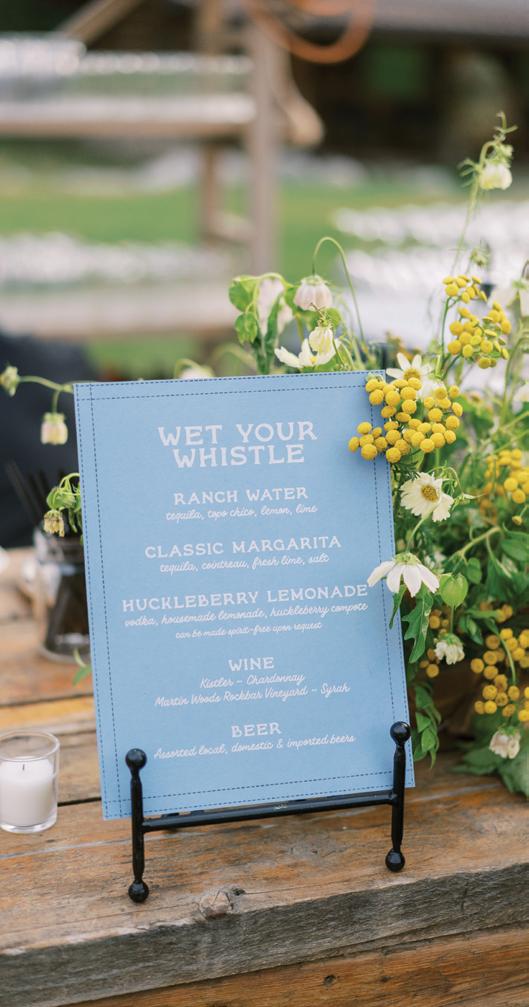 Makenzie and Alex planned a cozy, cabininspired wedding with Ralph Lauren flair for 90 guests at Beano’s Cabin. Opting not to do a first look, Alex first saw his bride in a stunning Dana Harel gown as she walked down the aisle toward the sweeping peaks of the Rockies, her cathedrallength veil drifting in the wind. For the reception, pops of yellow wildflowers and the glow of candlelight accented the tables, adding to the intimate, familydinner atmosphere that ended up being the couple’s favorite part of the day.. Looking back, Makenzie shared, “Once the dance floor opened, it never stopped; friends on shoulders, spins straight out of Blades of Glory and even a few ripped suit pants. We felt endlessly celebrated and so loved.”