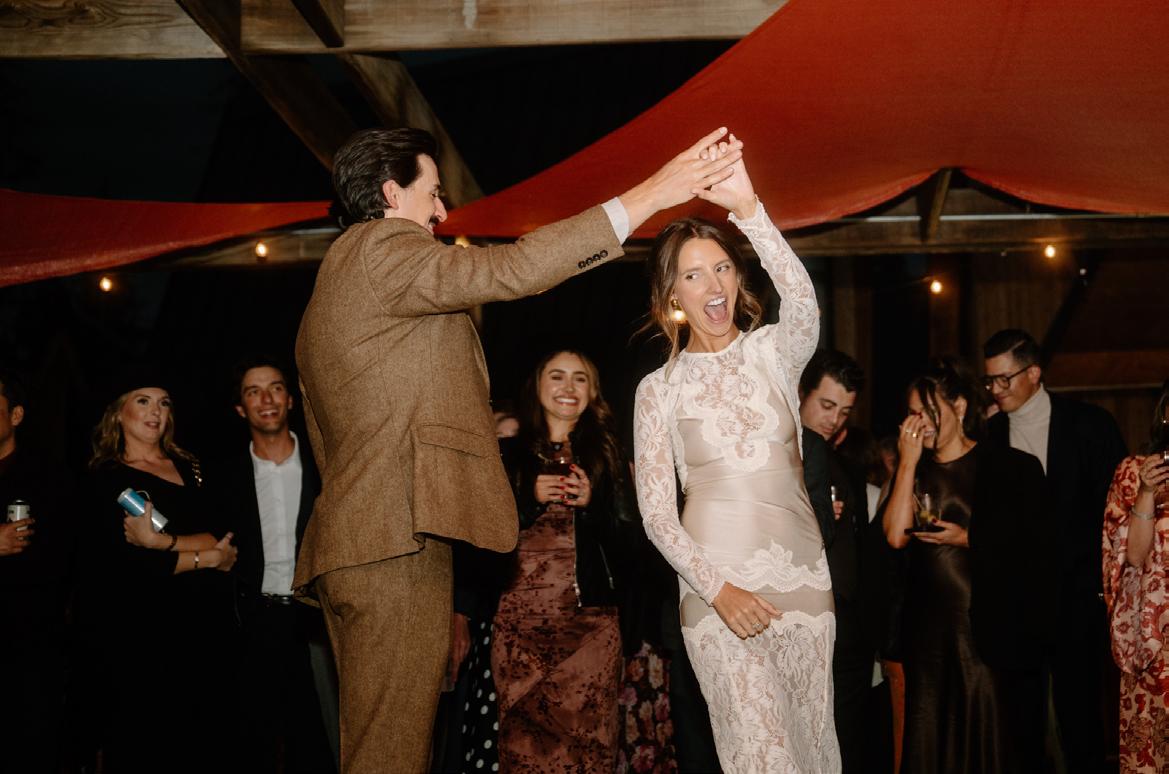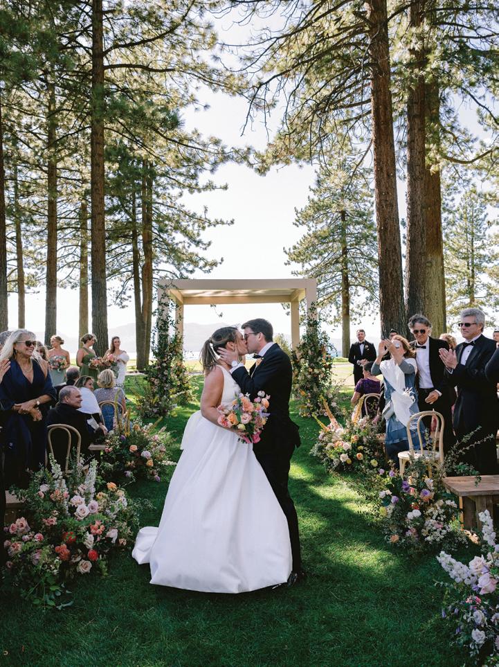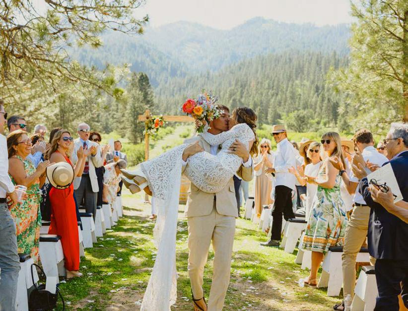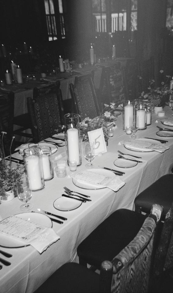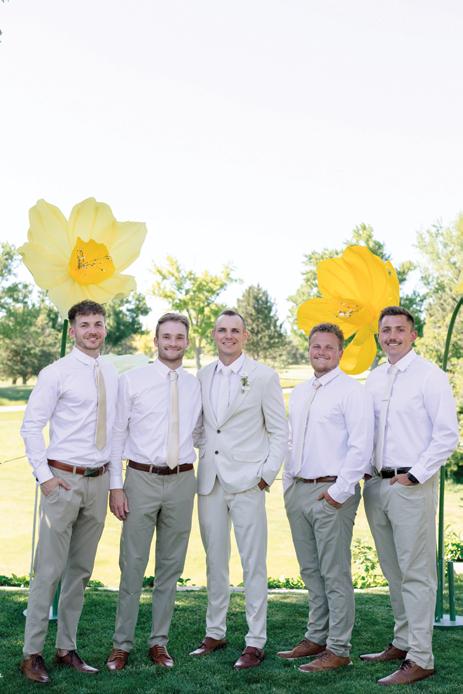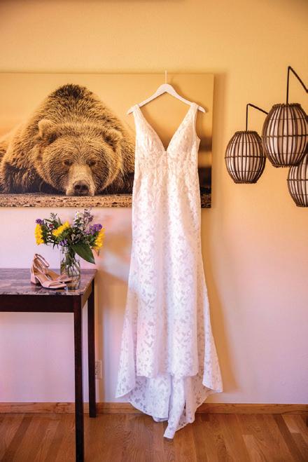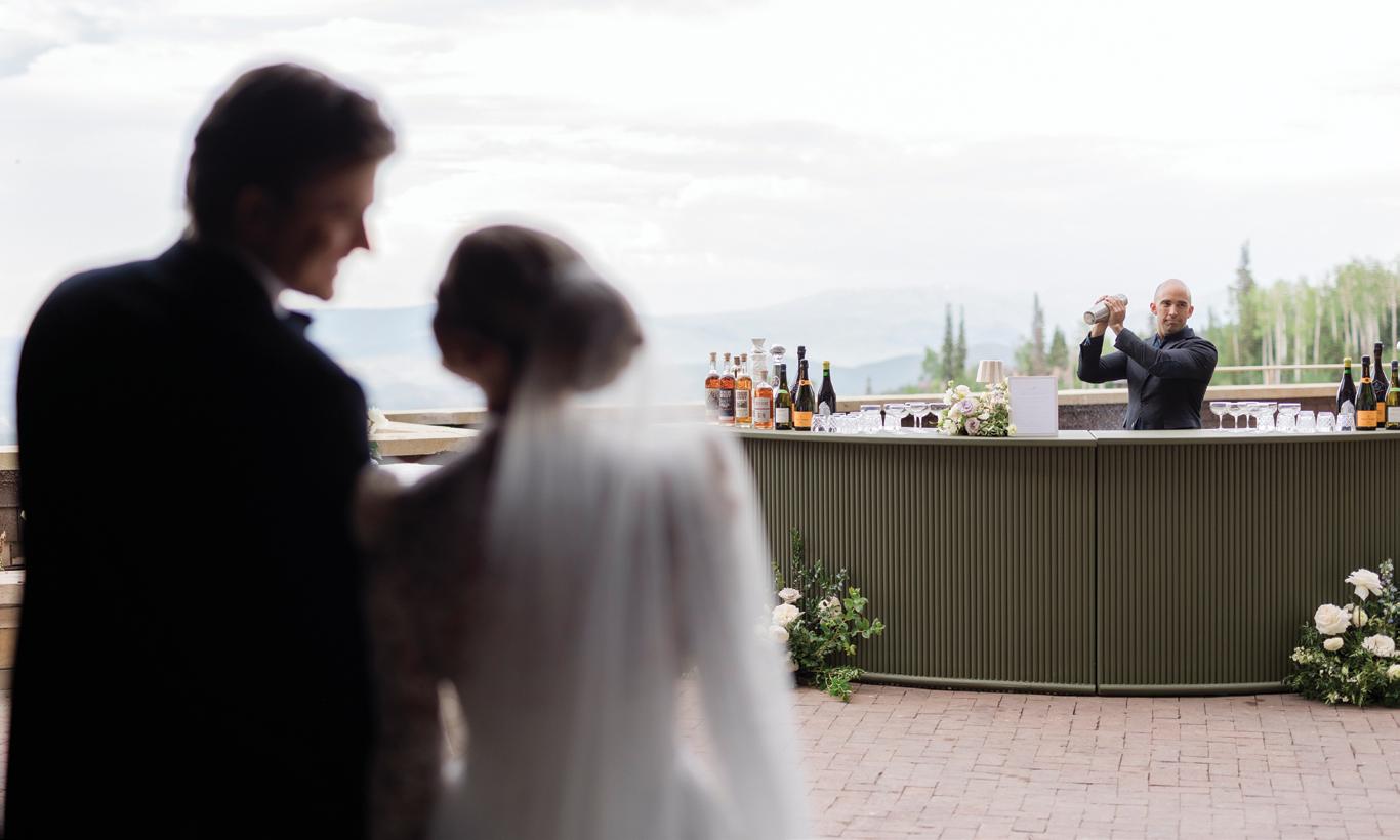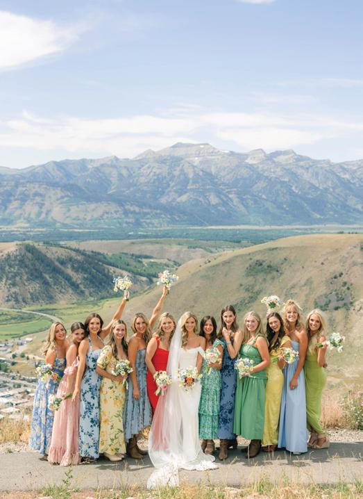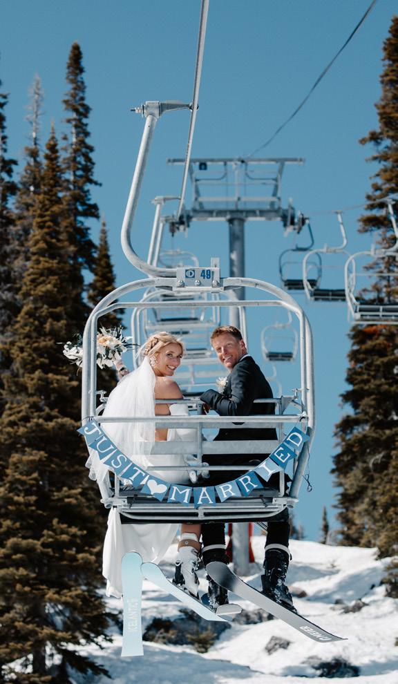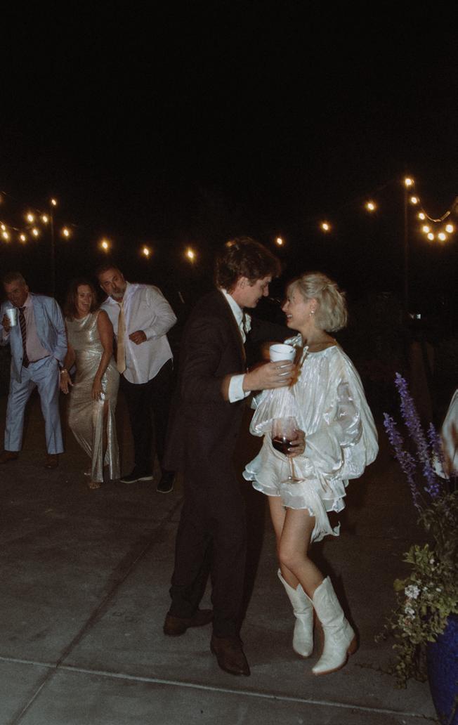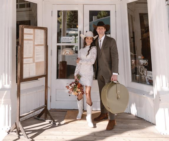 Makenzie and Alex planned a cozy, cabininspired wedding with Ralph Lauren flair for 90 guests at Beano’s Cabin. Opting not to do a first look, Alex first saw his bride in a stunning Dana Harel gown as she walked down the aisle toward the sweeping peaks of the Rockies, her cathedrallength veil drifting in the wind. For the reception, pops of yellow wildflowers and the glow of candlelight accented the tables, adding to the intimate, familydinner atmosphere that ended up being the couple’s favorite part of the day.. Looking back, Makenzie shared, “Once the dance floor opened, it never stopped; friends on shoulders, spins straight out of Blades of Glory and even a few ripped suit pants. We felt endlessly celebrated and so loved.”
