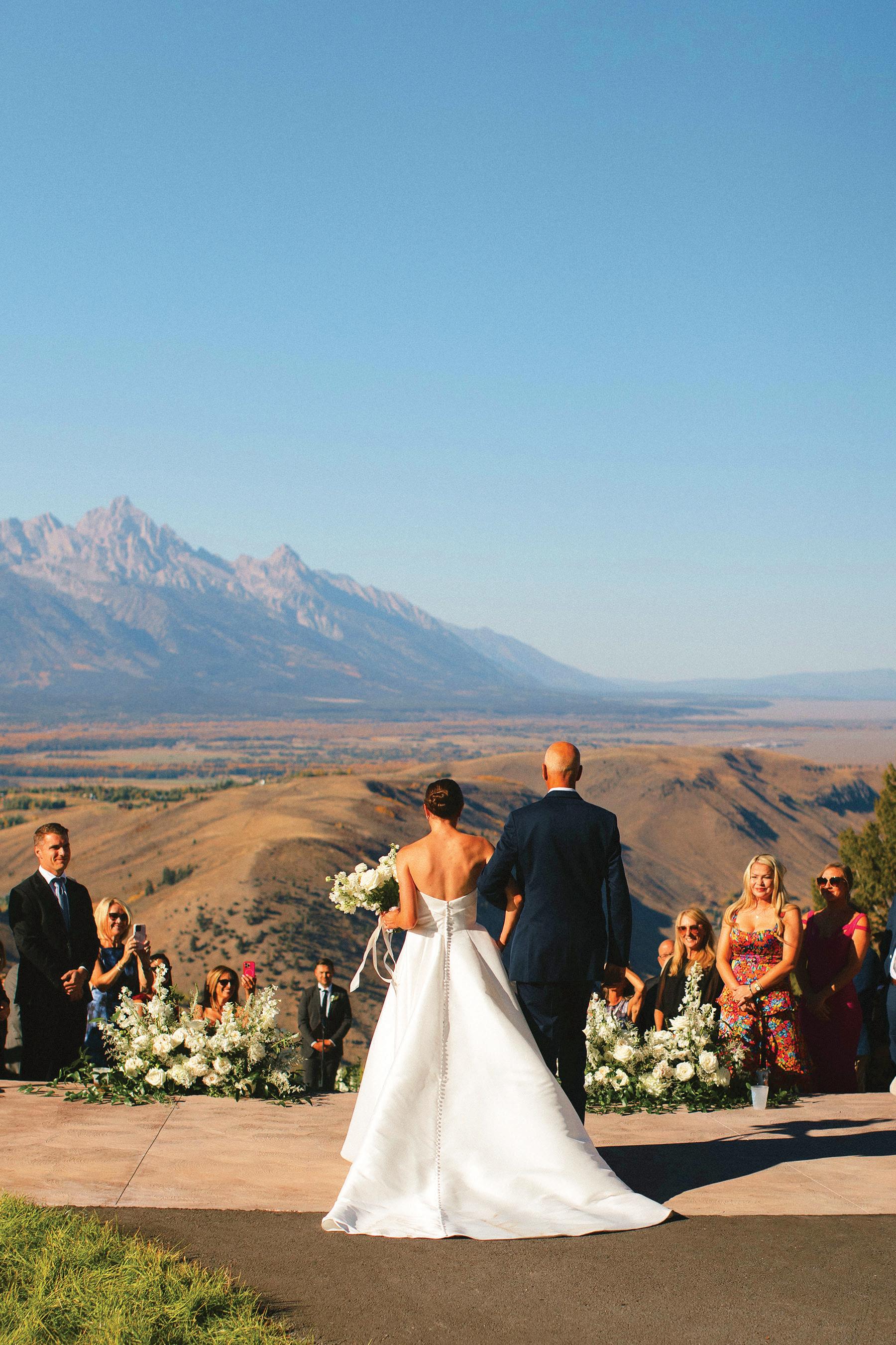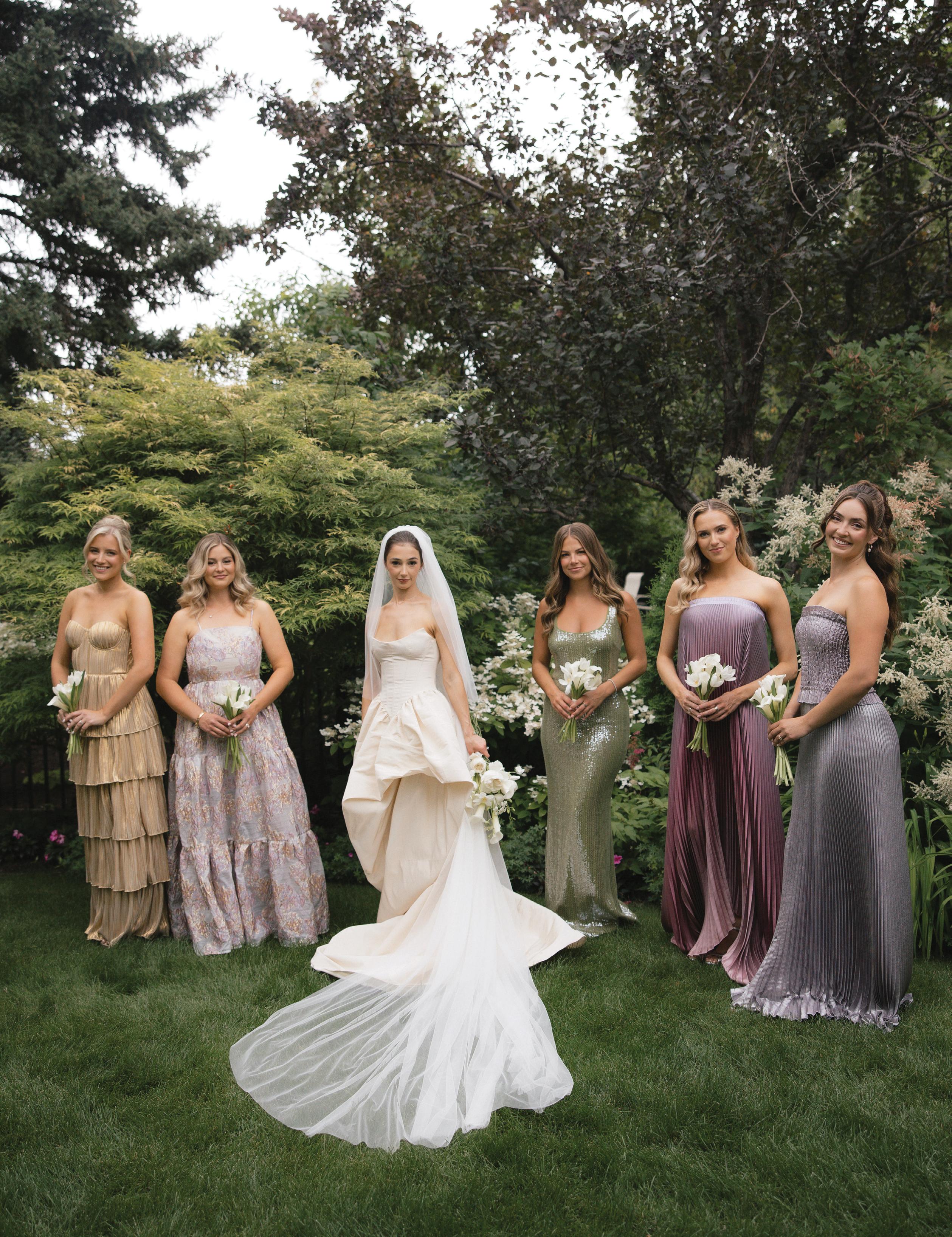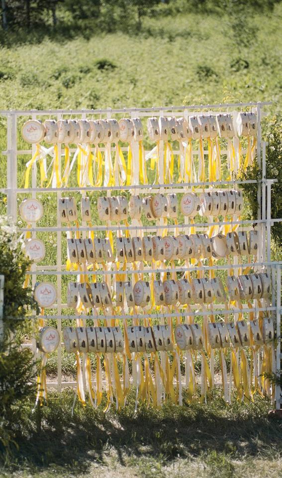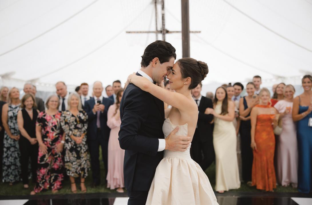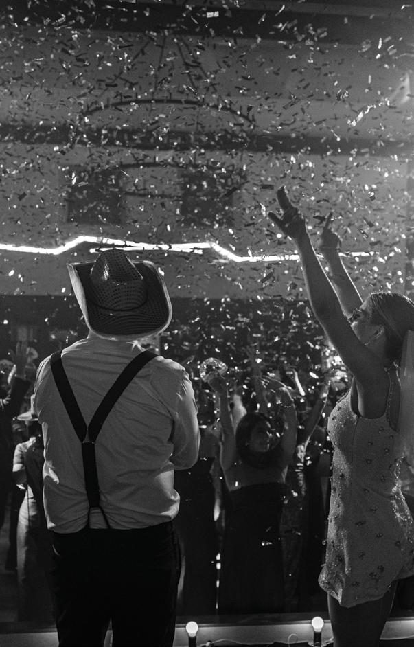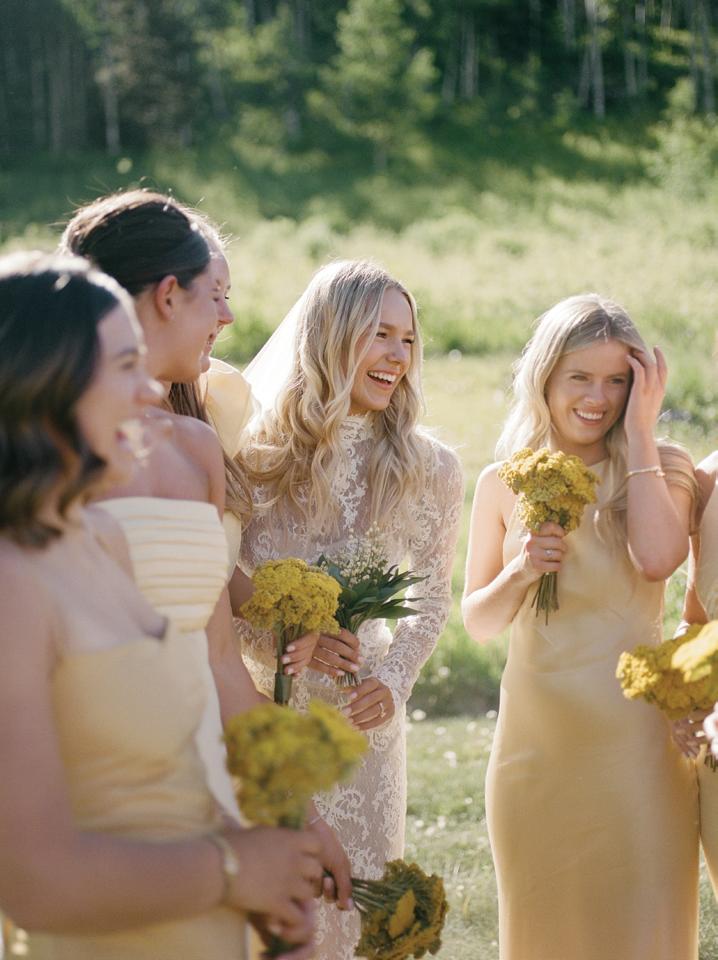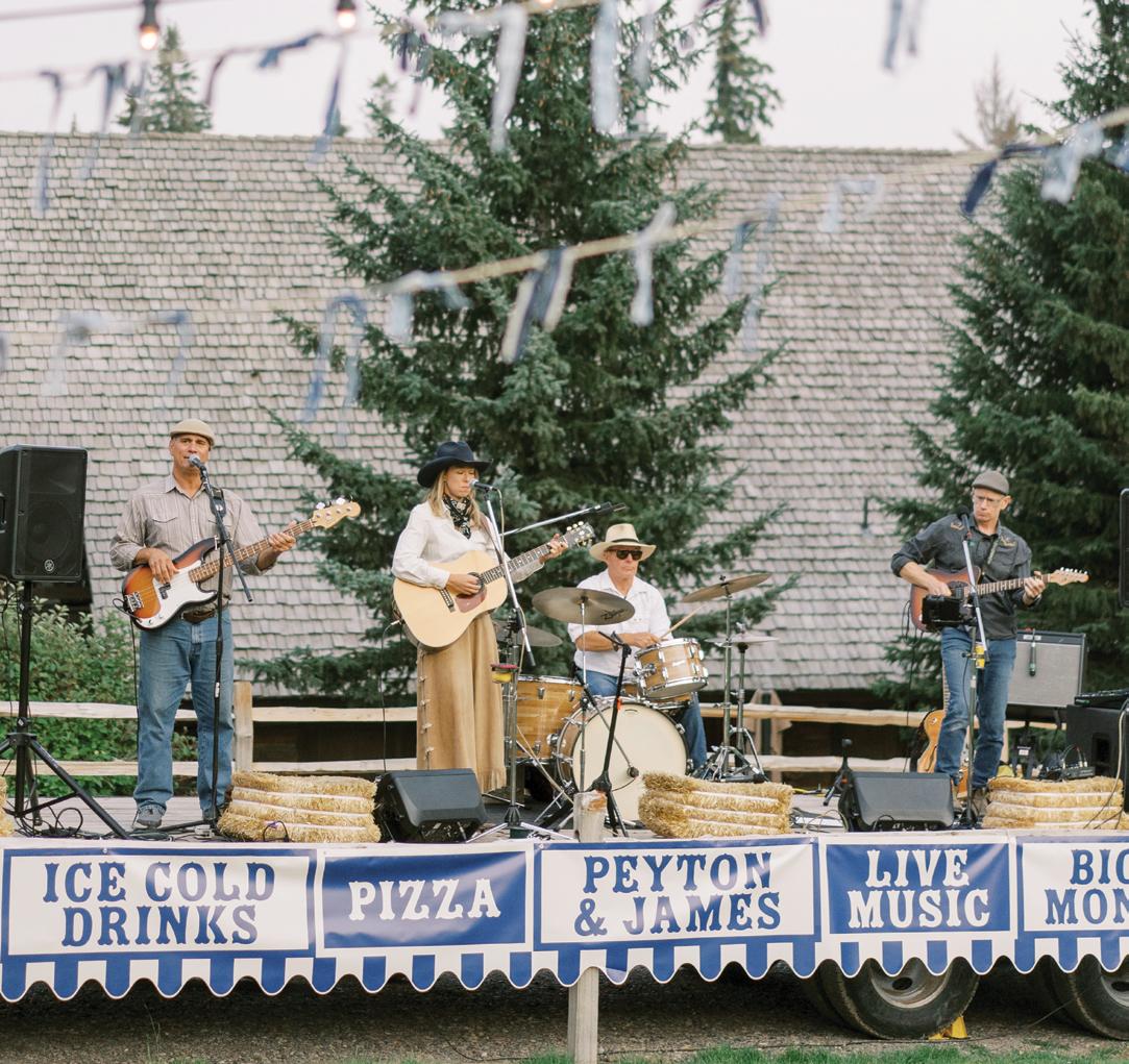Makenzie and Alex planned a cozy, cabininspired wedding with Ralph Lauren flair for 90 guests at Beano’s Cabin. Opting not to do a first look, Alex first saw his bride in a stunning Dana Harel gown as she walked down the aisle toward the sweeping peaks of the Rockies, her cathedrallength veil drifting in the wind. For the reception, pops of yellow wildflowers and the glow of candlelight accented the tables, adding to the intimate, familydinner atmosphere that ended up being the couple’s favorite part of the day.. Looking back, Makenzie shared, “Once the dance floor opened, it never stopped; friends on shoulders, spins straight out of Blades of Glory and even a few ripped suit pants. We felt endlessly celebrated and so loved.”