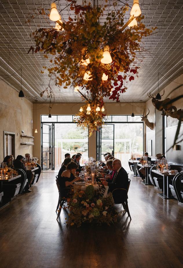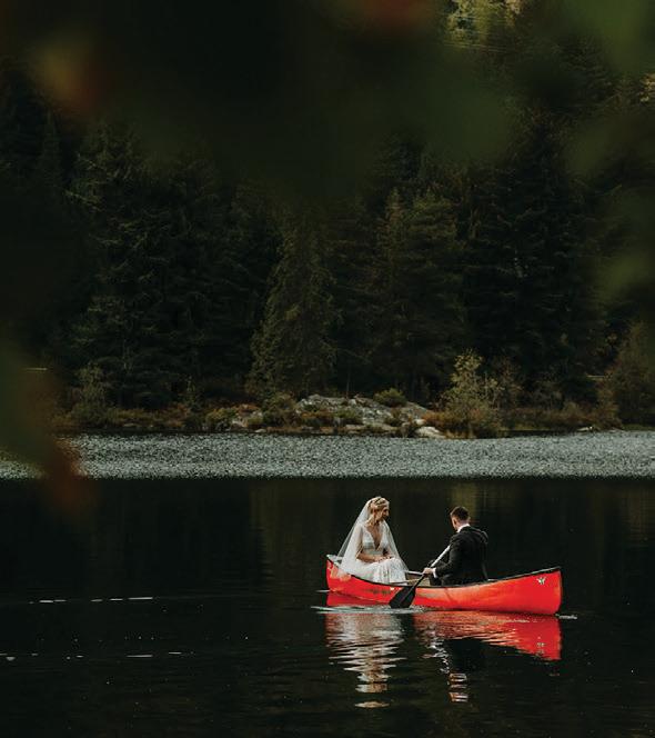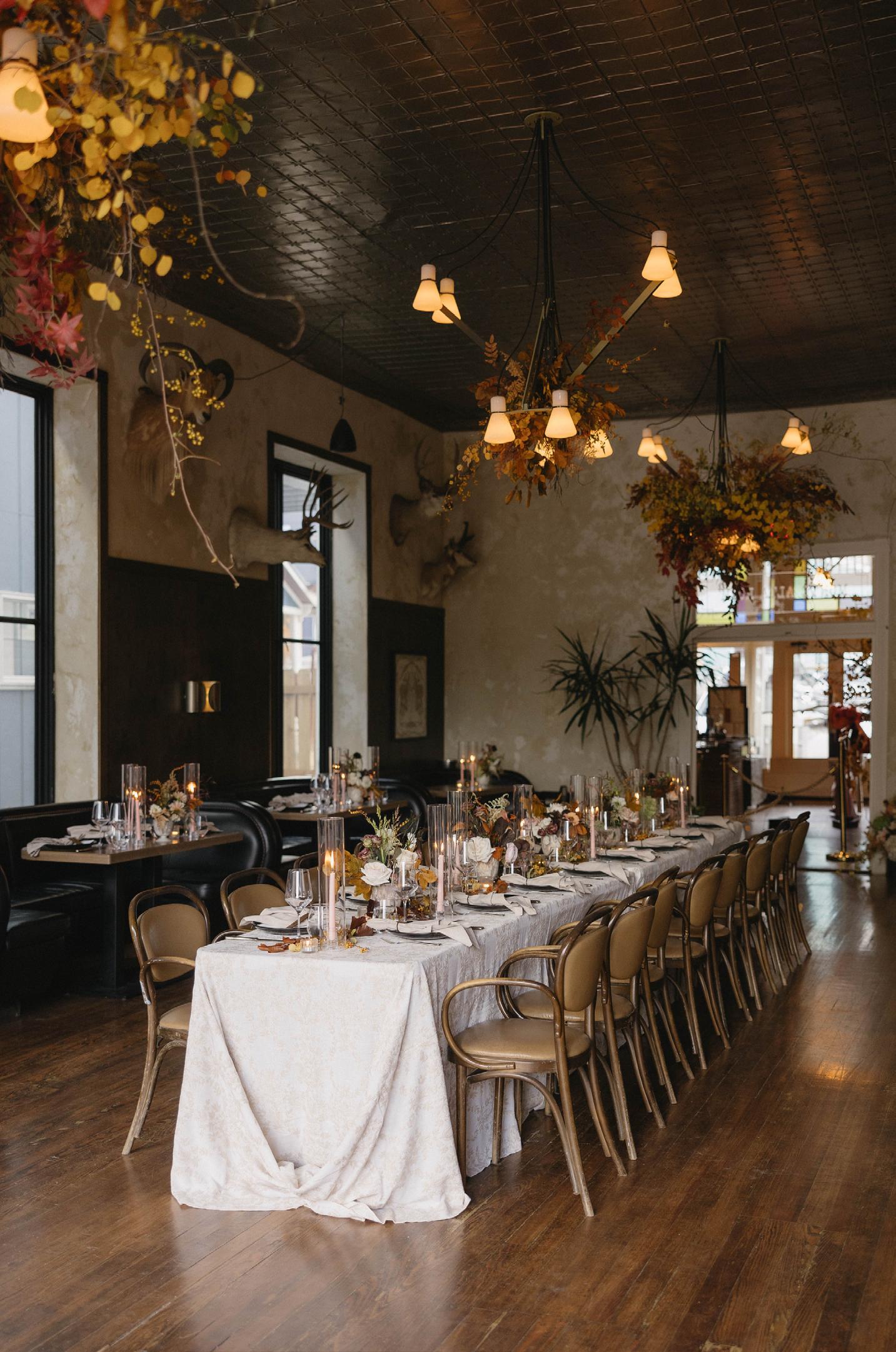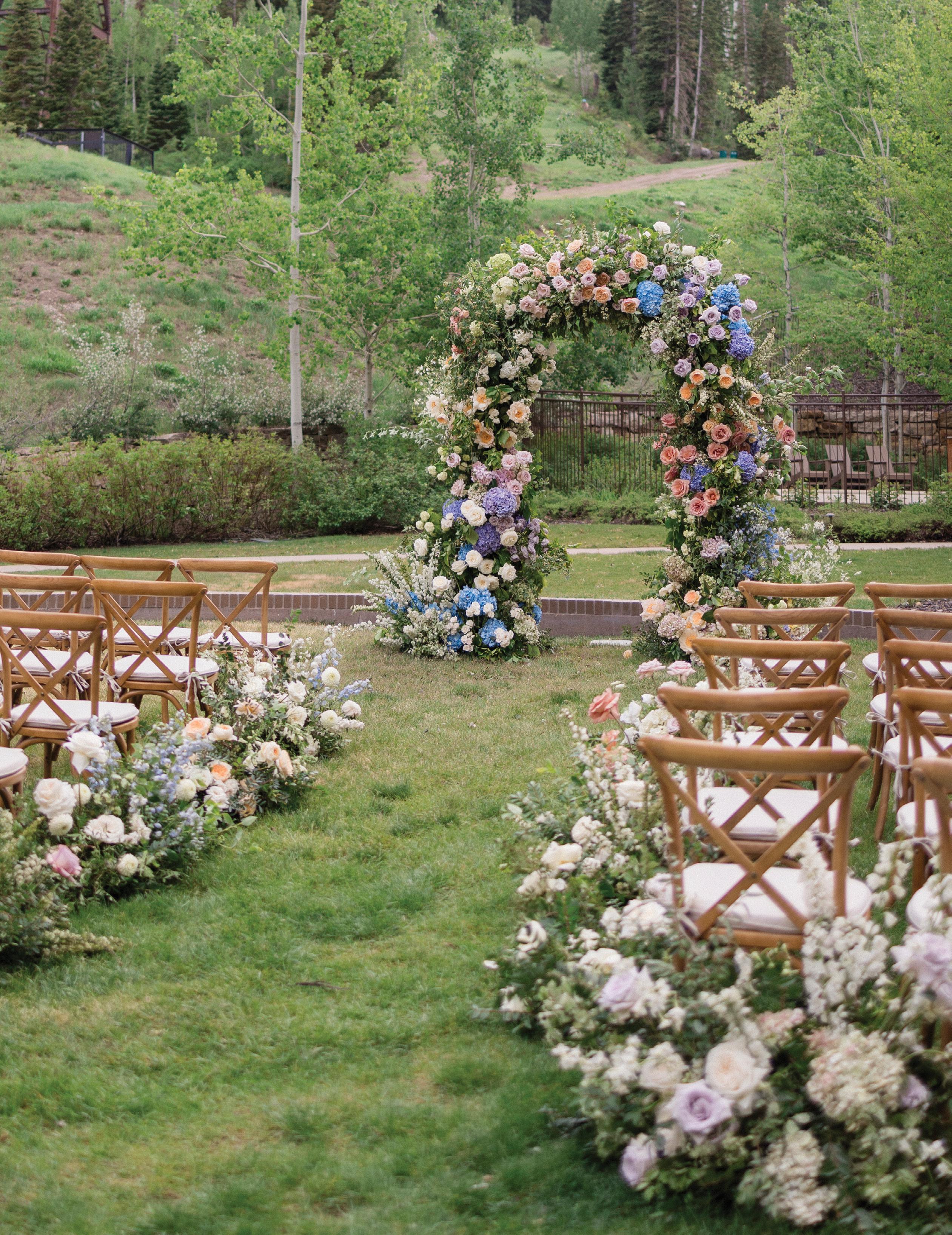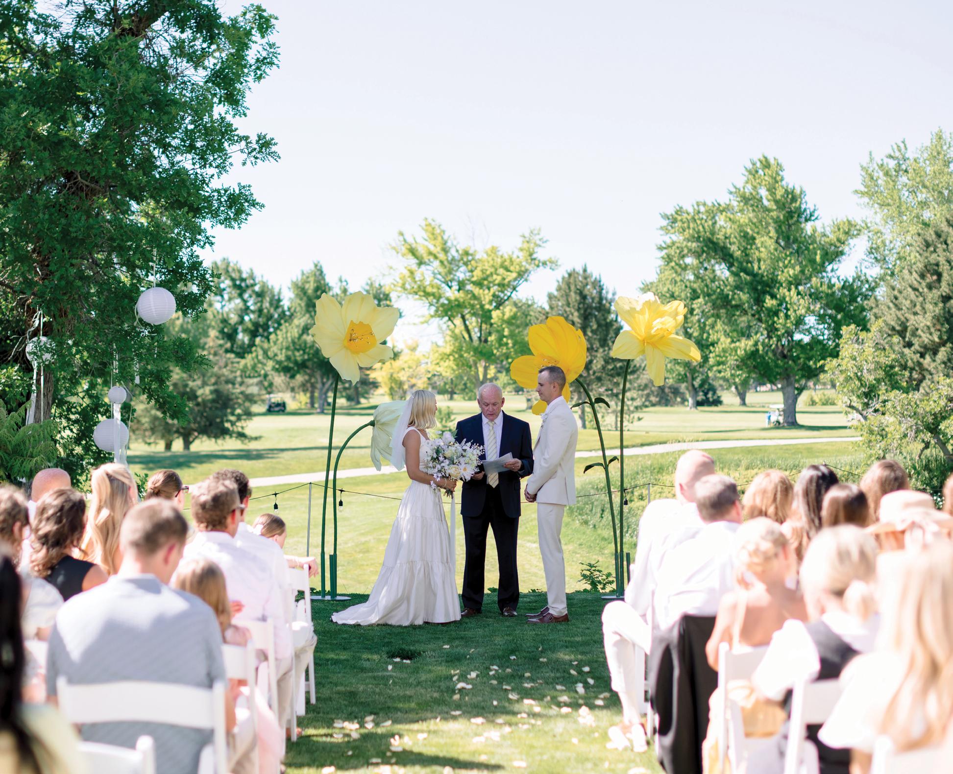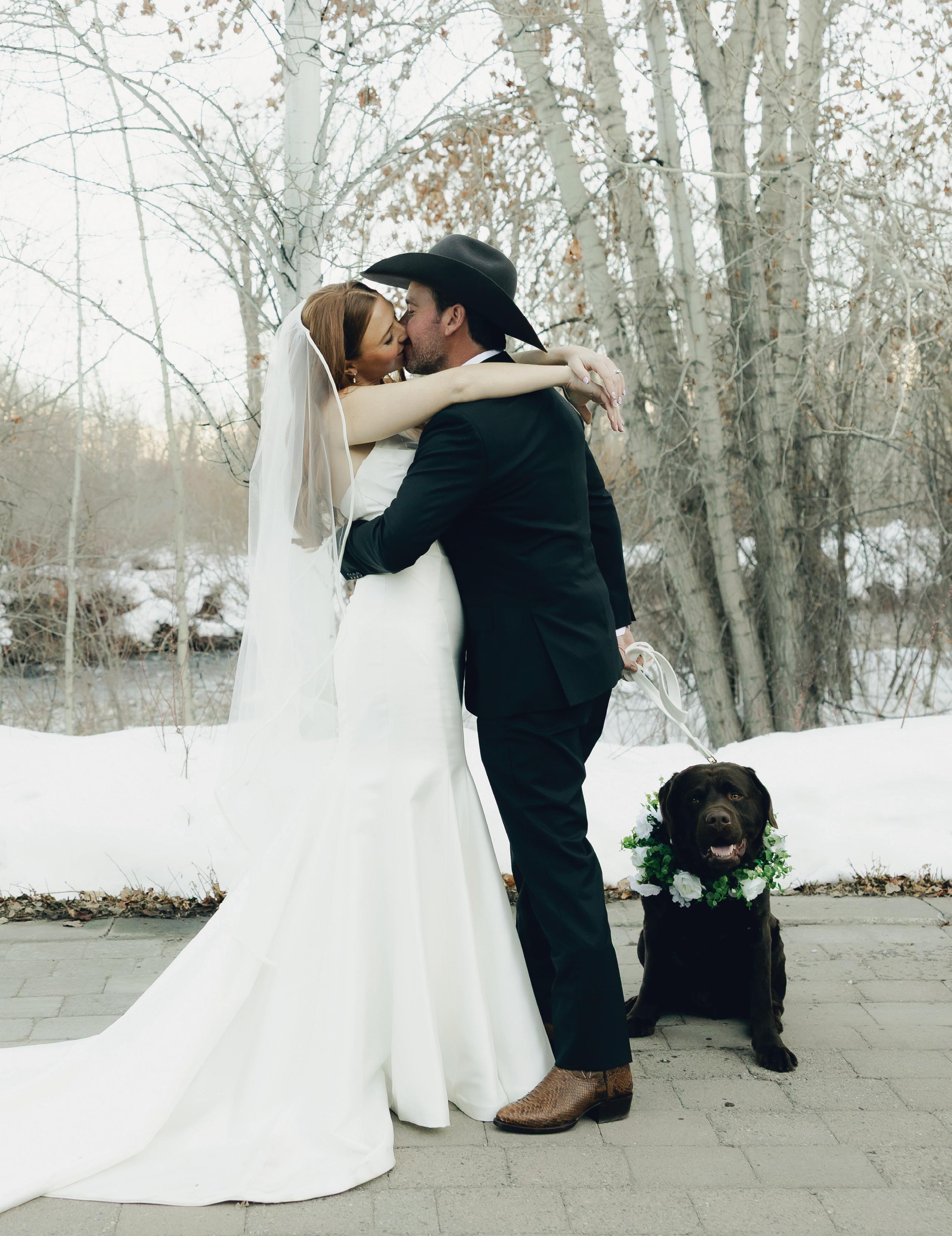 Makenzie and Alex planned a cozy, cabininspired wedding with Ralph Lauren flair for 90 guests at Beano’s Cabin. Opting not to do a first look, Alex first saw his bride in a stunning Dana Harel gown as she walked down the aisle toward the sweeping peaks of the Rockies, her cathedrallength veil drifting in the wind. For the reception, pops of yellow wildflowers and the glow of candlelight accented the tables, adding to the intimate, familydinner atmosphere that ended up being the couple’s favorite part of the day.. Looking back, Makenzie shared, “Once the dance floor opened, it never stopped; friends on shoulders, spins straight out of Blades of Glory and even a few ripped suit pants. We felt endlessly celebrated and so loved.”