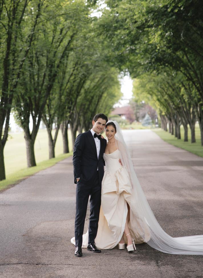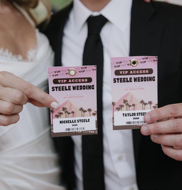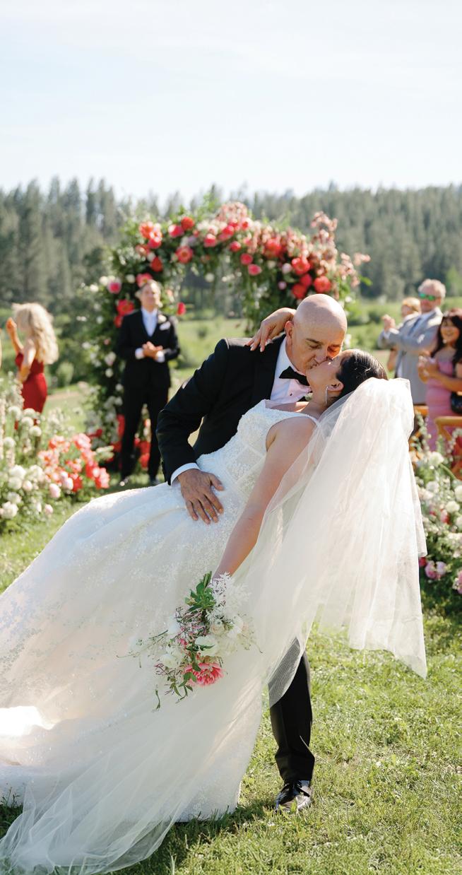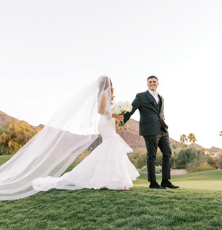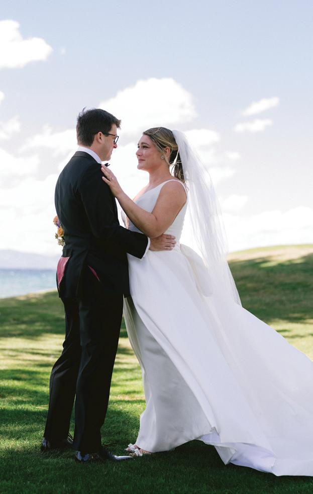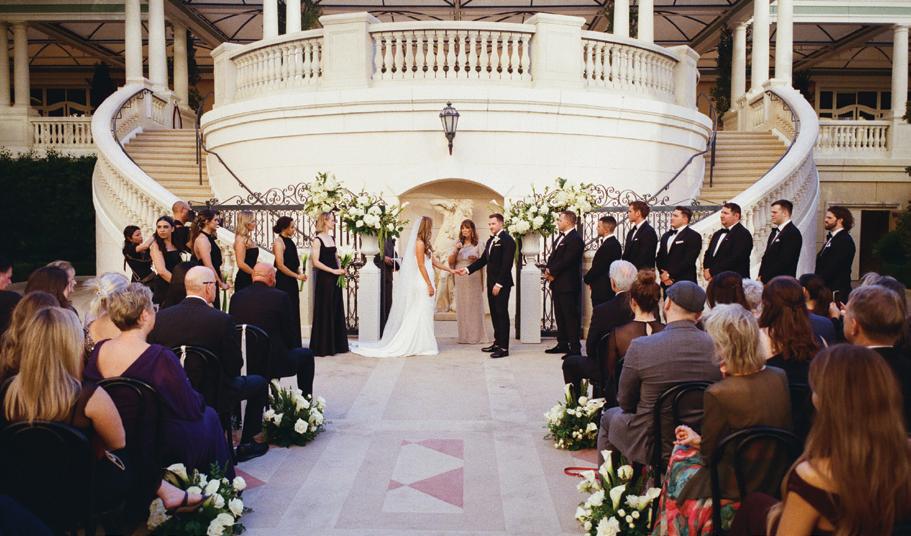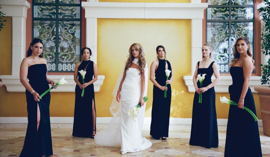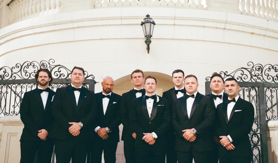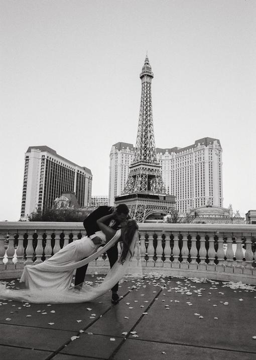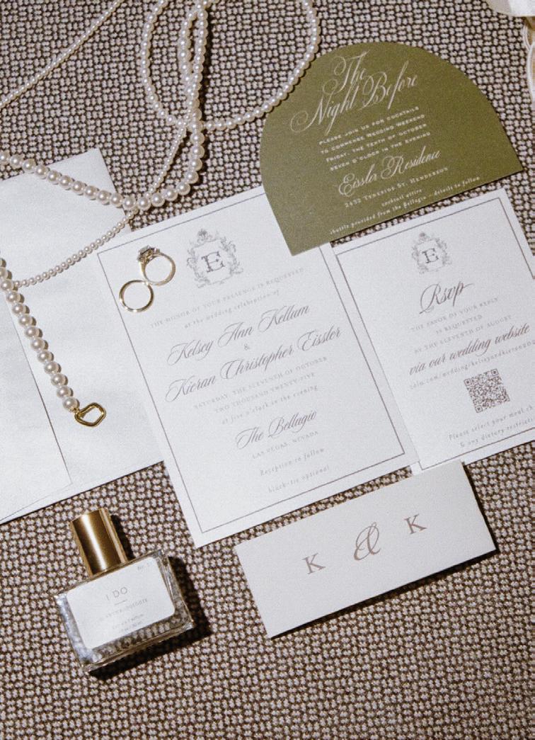 Kelsey and Kieran planned an old-world Italian celebration at The Bellagio for 105 of their closest friends and family. Now calling Las Vegas home, choosing the iconic resort felt like the perfect fit for their vision and the start of their forever together. Their ceremony unfolded on the Julietstyle terrace framed with lush calla lilies, a meaningful choice, as they were the same flowers Kieran’s late mother, Amy, carried on her own wedding day. Kieran and his brother also wore lockets tucked inside their jackets to keep her close. After exchanging vows, guests moved into a candlelit reception where long satin-draped tables, crystal glassware and towering arrangements created a warm, romantic glow. The night was filled with espresso martinis, heartfelt toasts and a packed dance floor before Kelsey and Kieran ended the evening with everyone letting loose to “Unwritten” by Natasha Bedingfield.