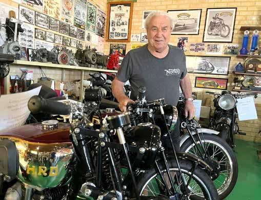 odd on loan from mates “hiding them from the missus”. Most readers will be familiar with the museum complex just off the highway at Nabiac crammed with bikes of all ages, shapes and sizes. Brian and Marg’s excuse was to preserve Australia’s motorcycling heritage and prevent significant bikes from leaving the country. Their favourites include a rare 1919 Kenilworth scooter, a twincylinder water-cooled two-stroke Scott, and a Vincent Black Knight.