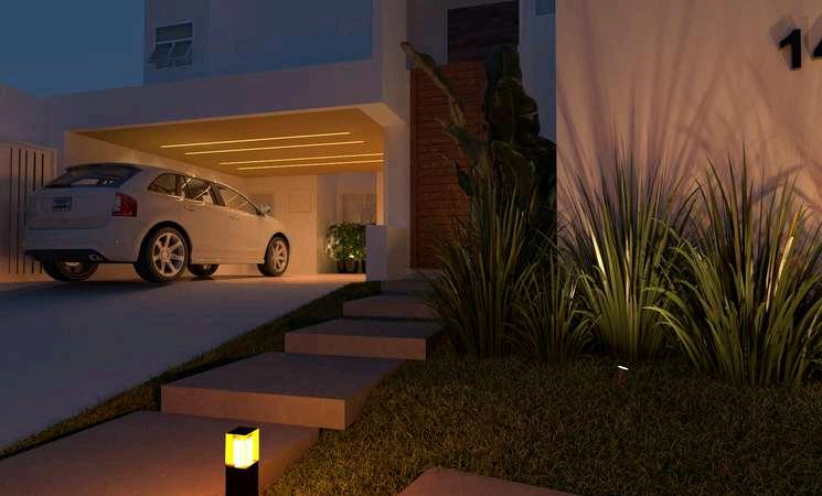 Imagem para visualização da garagem e o jardim com o projeto de revestimentos, acessos e iluminação.