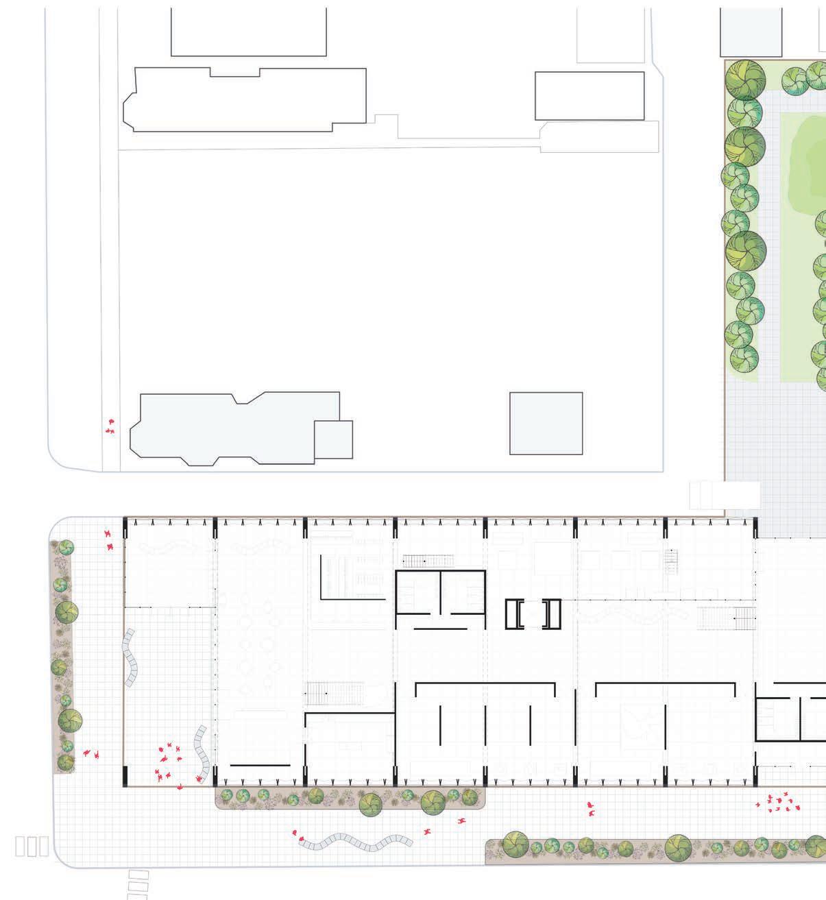 Holding the corners of each block that are undeveloped using vegetation will allow locals to activate and define what programming could be developed.