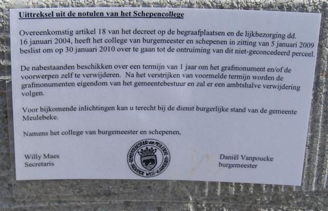 De politiek van de Gemeente Meulebeke om de niet-geconcedeerde percelen op haar begraafplaatsen na verloop van een relatief korte periode op te ruimen, zorgt er voor dat hierdoor deze bron van informatie relatief beperkt is. Bij het verzamelen van deze informatie is nog net gebruik gemaakt kunnen worden van gegevens op een deel van de grafzerken die begin 2010 zullen weggenomen worden.
