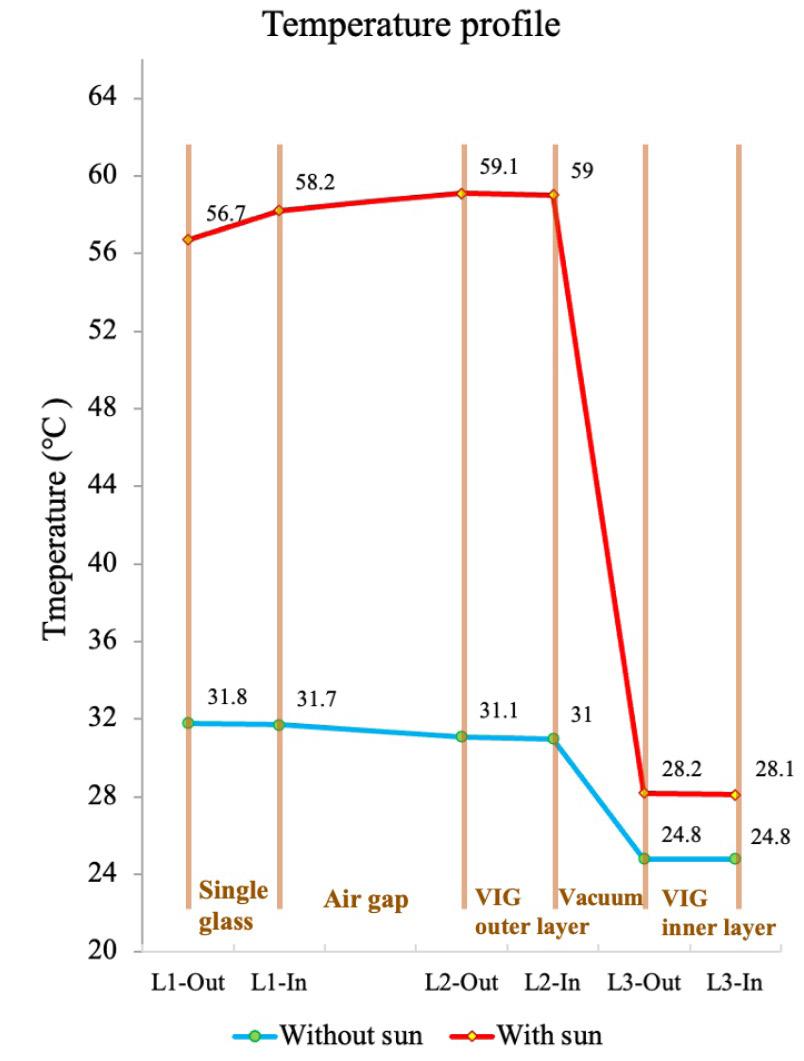 The energy performance of the Vacuum Insulated Glass (VIG) retrofit application significantly depends on the thermal response of the vacuum glazing. Under summer conditions, the VIG retrofit stabilizes indoor surface temperatures by reducing the inner single glass surface temperature from 31.8ºC to 24.8ºC without solar radiation and from 56.7ºC to 28.2ºC with solar radiation. This shows VIG retrofit’s excellent thermal insulation, stabilizing indoor surface temperatures under varying weather conditions. Furthermore, an additional benefit is that the VIG retrofit could eliminate the risk of condensation on the inside glass surface in winter because the inside vacuum glass surface temperature is also close to indoor space air temperature so that the inside glass surface temperature hardly drops to the dewpoint temperature of indoor air.