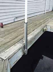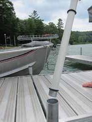 If you don’t have dock posts, we manufacture a bracket that includes a U-bolt. This is a perfect way to mount a 2” O.D. aluminum dock post (tube) next to your dock. This would be a post that you would source from a marine or hardware store that might be 4 feet to 8 feet tall depending on how deep your lake is at the point of installation, as illustrated in the photos. You would simply measure from where you want the top of the pipe down to the lake bottom and purchase that length of pipe along with either an “auger” screw bottom or a flat plate bottom –both of which are available in cast aluminum or injected plastic. This bracket with U-bolt, would secure your post to your dock. See Option B above, to learn about the horizontal bolt you would need to put about 18” down, as well as the O-Rings or dock pole bushing. (continued on page 7 )