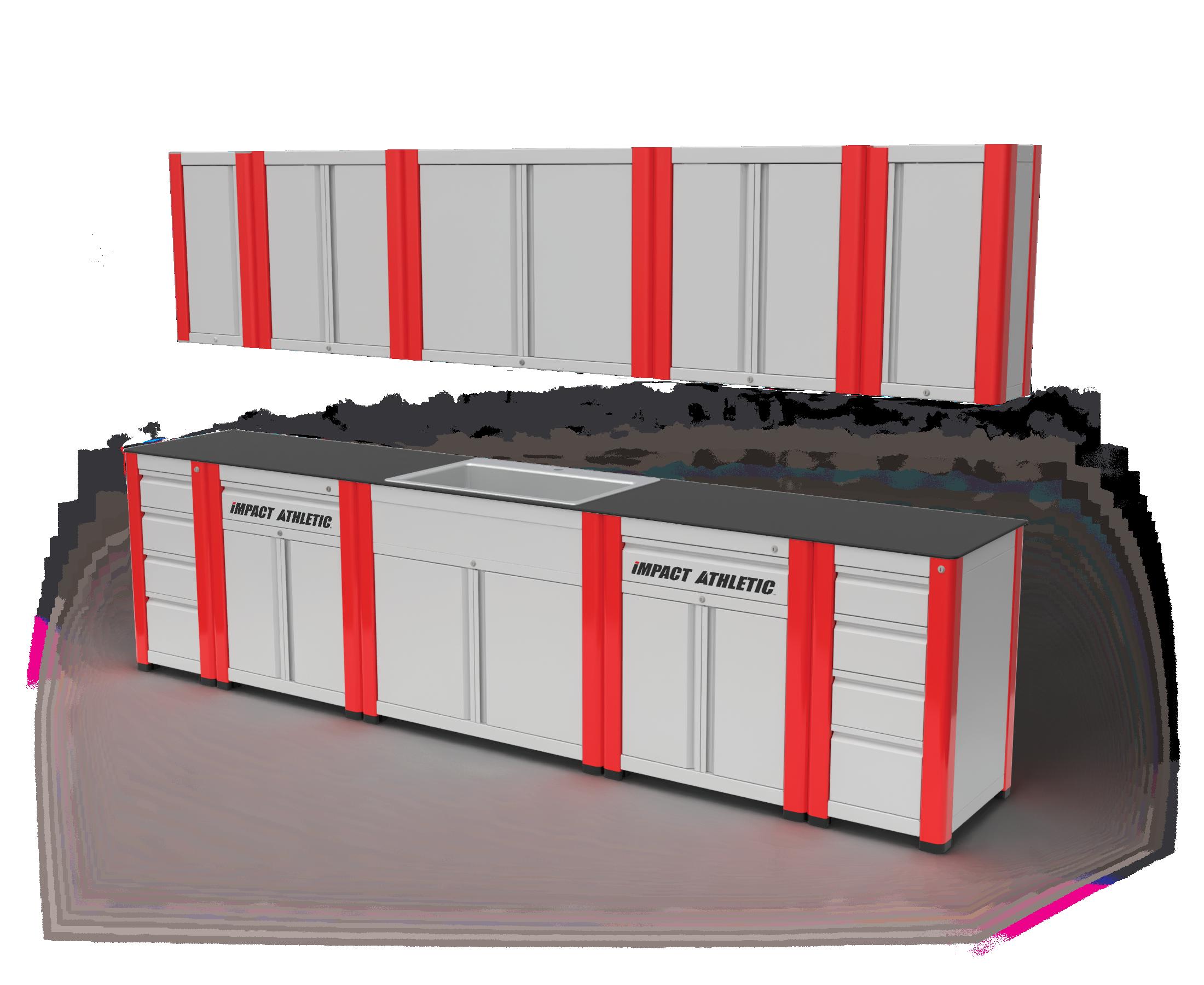 Lockable storage room. Custom configurations are available including but not limited to addition of sinks, trash cans, and corner pieces.