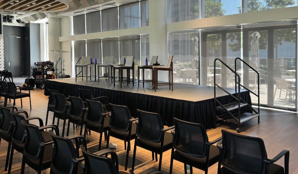 Convert your seating areas into media platforms with StageRight’s media platform overbuild. The system is quick and easy to setup/strike and provides a solid functional work environment for media personnel. Optional wire management and custom front panels available.