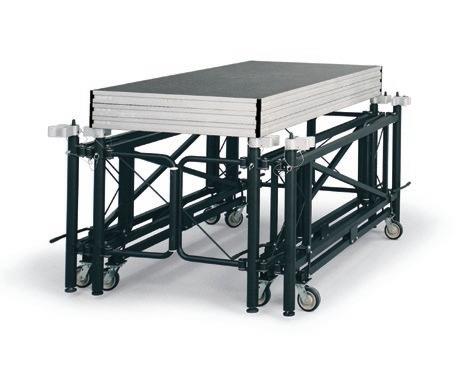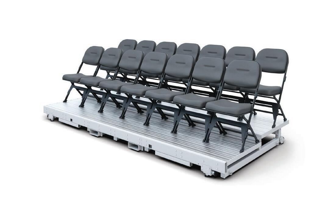 The StageRight XML-3200 Retractable Seating Riser offers quick conversions for multi-applications — the ultimate in versatility. Units retract to a compact footprint to fit through most doorways. Units can be placed sideby-side or utilize the patented bridge deck, reducing the number of units required. An open deck design allows for the use of a variety of temporary seating options.