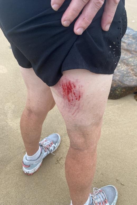Once at the beach we skirted the shore to see just how far the swimmable sections reached. Blocked by some formidable rocks we found a small, protected beach and prepared to go for a dip. Just as we were about to dive in Jill noticed a school of bait fish gathering in the sheltered cove. Ordinarily that would be OK but on closer inspection we saw what looked very much like a shark (dorsal fin was a giveaway) rounding the fish up.