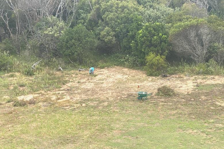 Geoff fired up the whipper snipper and trimmed around the flagpole, the circular wooden posts on the seaward side of the quadrangle and all the cottage one tank and foundation footings. The RAVAGE imposed mowing ban limited any mowing activity, so Geoff spent time touching up this story while Jill began pulling weeds in the yard northwest of cottage two. At this stage we were a little unsure about what to do with “pulled” weeds, so we bagged them in some old fertilizer bags we found in the gardening shed.