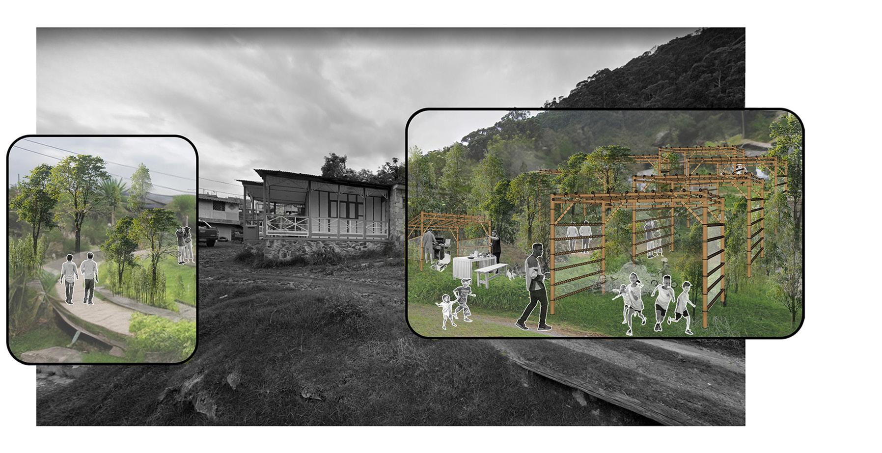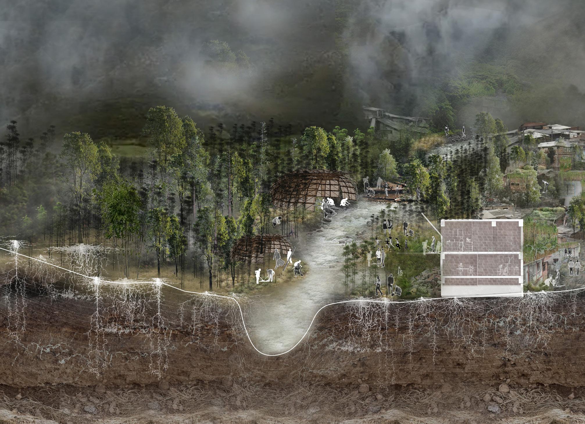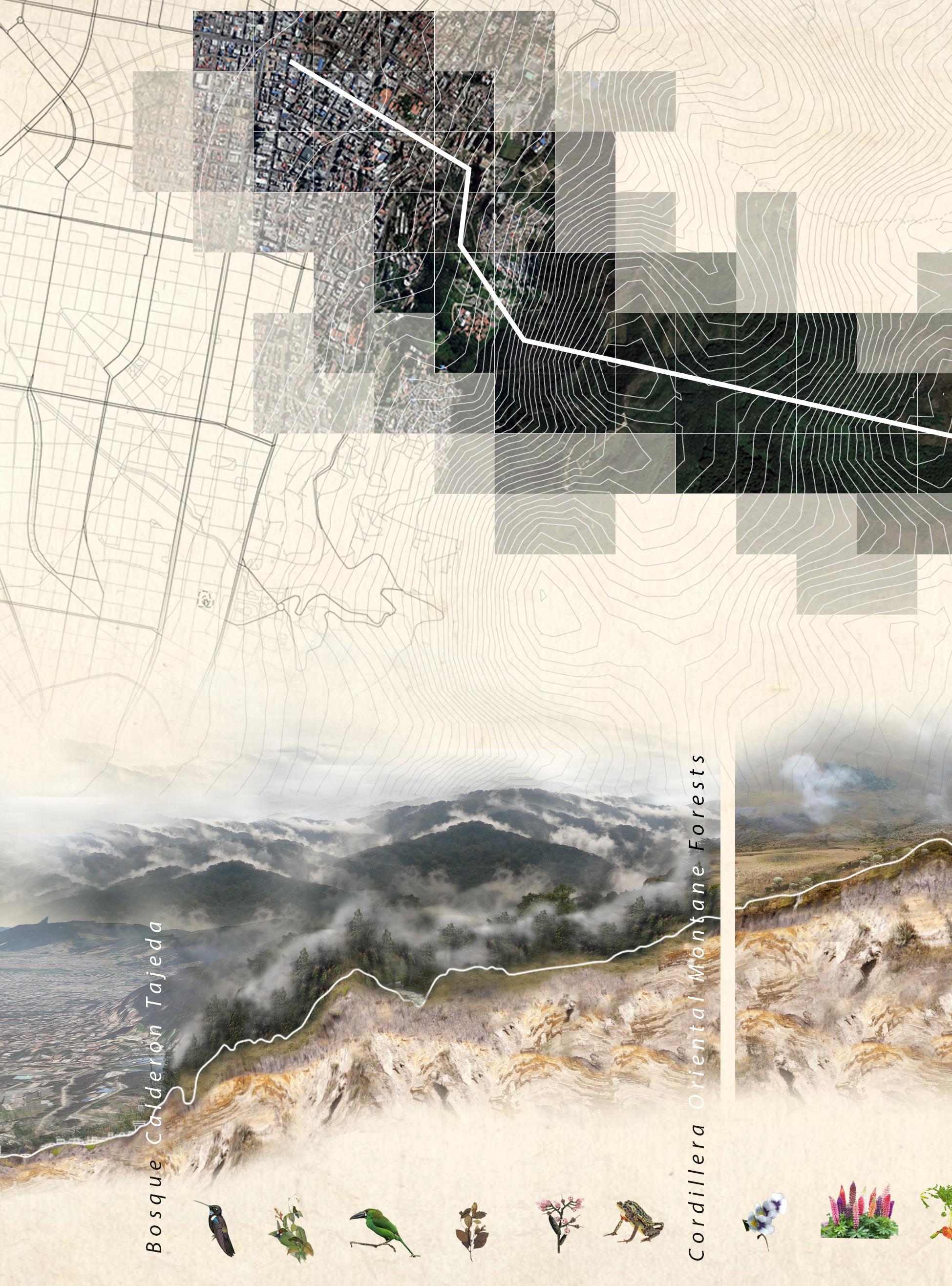 Bosque Calderón lies at the base of the Eastern Hills of Bogotá at the intersection of the montane forests and the rapidly expanding city of Bogotá. The neighborhood is rich in biodiversity and under constantly growing pressure from both sides - real estate developers trying to move in and the community being under a constant risk of landslides due to the degrading ecology. This project works to redefine the ecotone between the city and the forest, with the community of Bosque Calderón at its core. This project re-envisions Bosque Calderón as a model biotic community, acknowledging the residents as citizens of the forest and granting them the agency to repair the ecology, the capacity to develop a symbiotic relationship with other species, and the legal rights to their land.