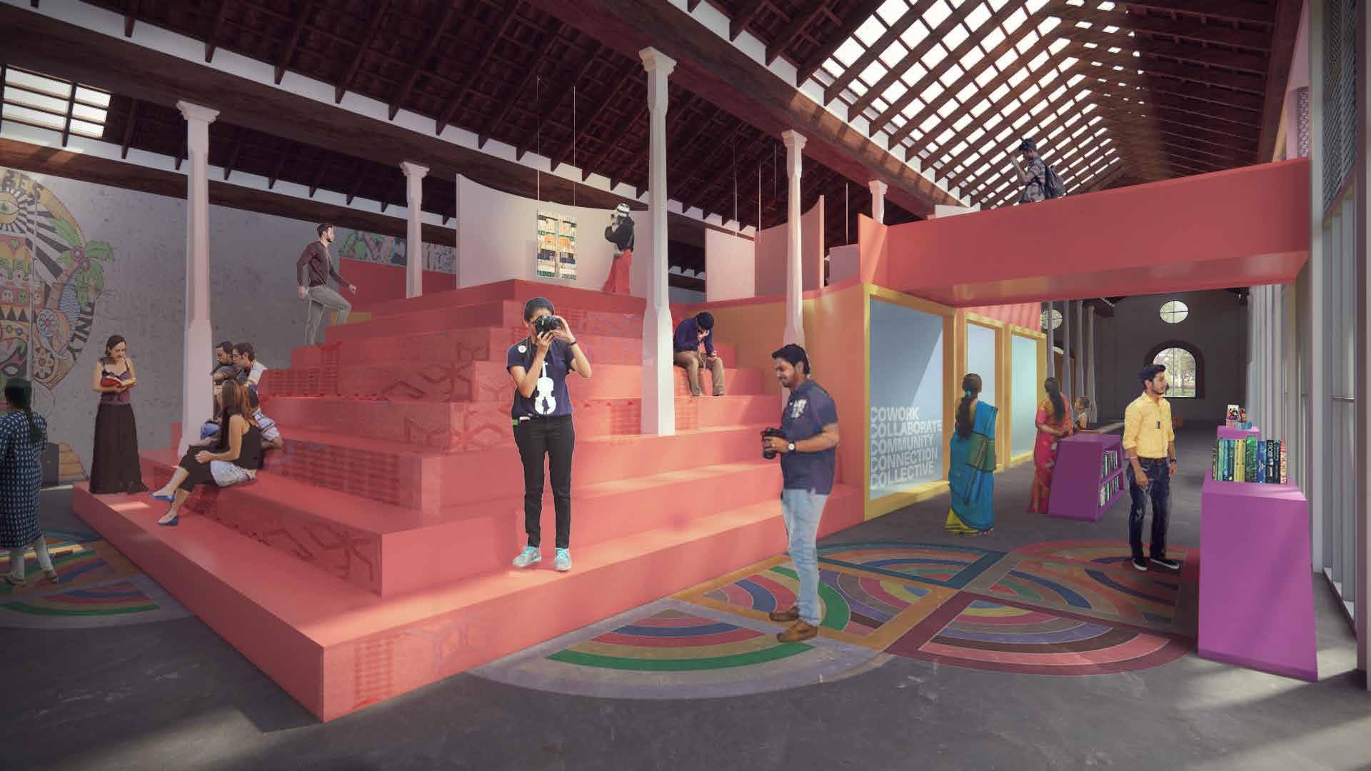 The vision is to foster the Mananchira complex as an urban living room, drawing in activities fromthe diverse programmatic milieu. The factory consists of three distinct zones,evident through the facade as well as the former weaving programs. These three distinct zones create three distinct forms and make room for a triptych theme of intervention as follows: