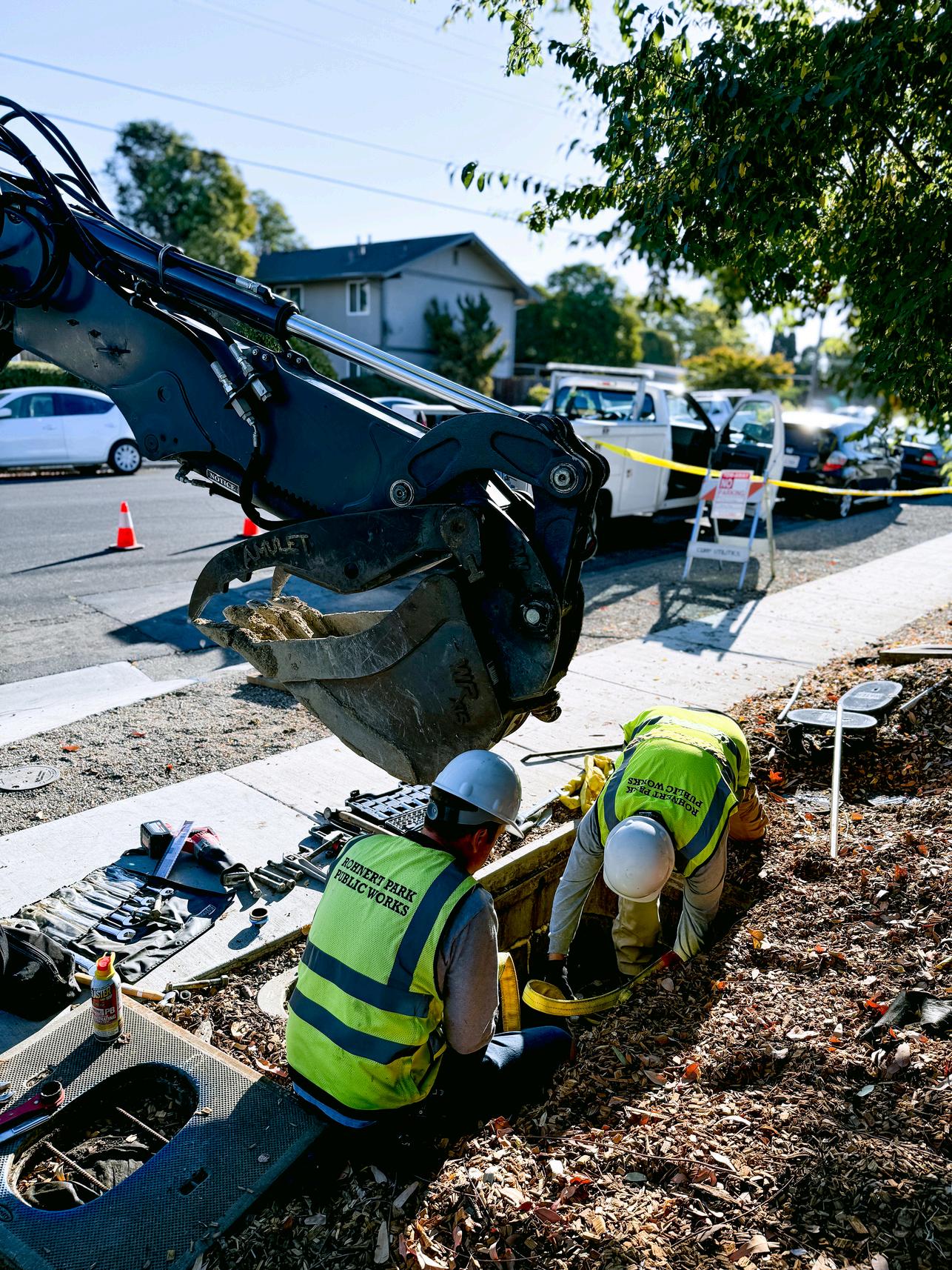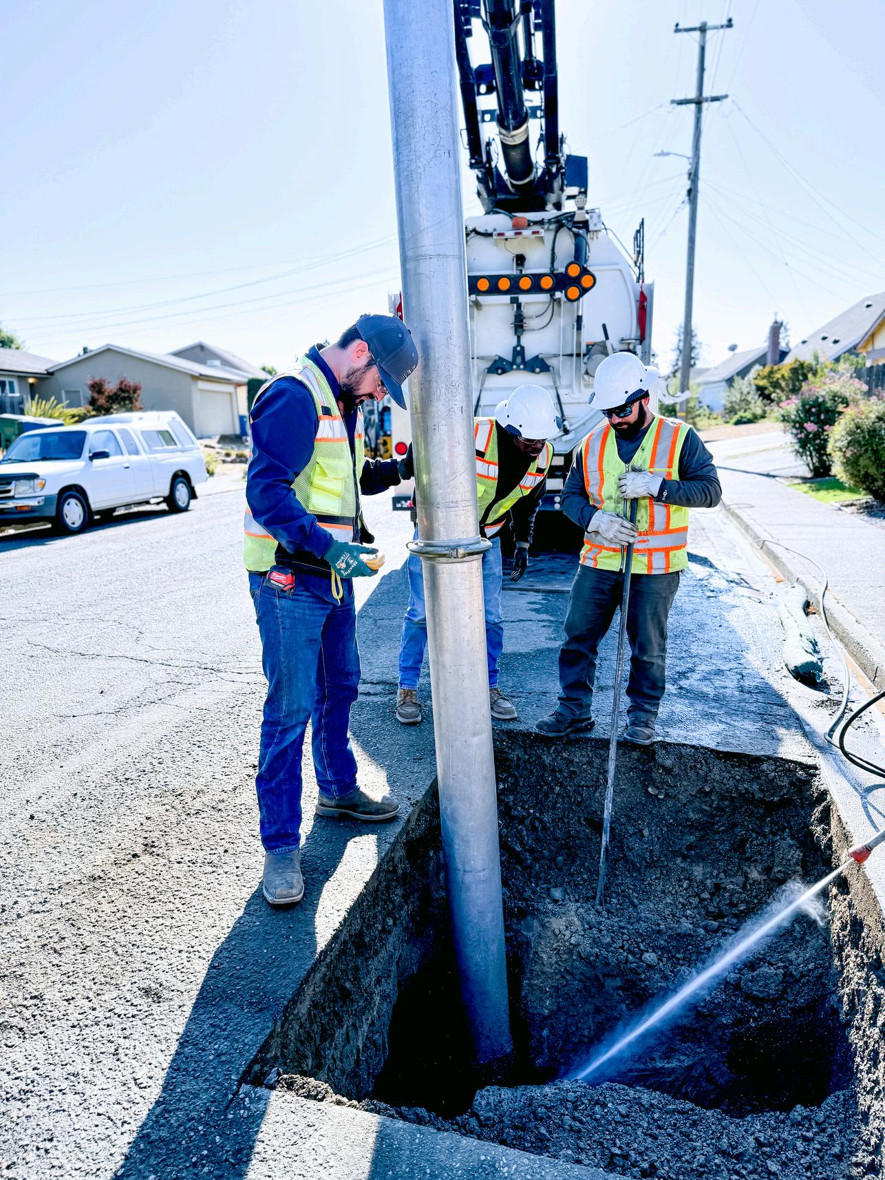 Osvaldo Segura (opposite), Jordan Oden (left), and Mitch Pearson (right) worked through the recent heat wave on a water leak repair in B Section