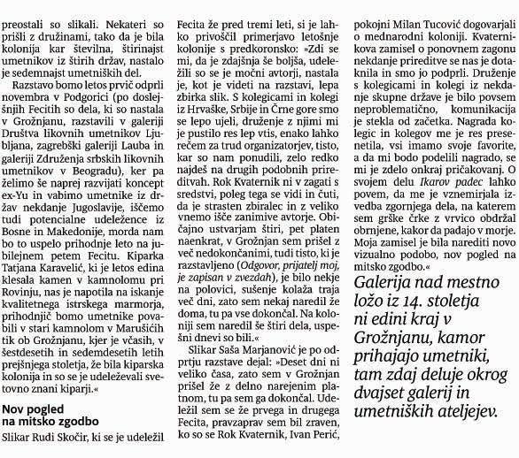 Na naše veliko zadovoljstvo, domaćini smo izložbe sa kolonije FECIT, koja je održana prošlog ljeta u Grožnjanu, u Istri. Podgorička Javna ustanova Muzeji i galerije (Moderna galerija), u saradnji sa inicijatorima te kolonije i gradskom galerijom „Fonticus“, predstaviće crnogorskoj likovnoj publici djela dvanaest umjetnika. Izložba je dobra prilika za unapređivanje dobrosusjedskih odnosa među narodima koji žive na području bivše Jugoslavije, kao i podsticanje mladih talentovanih ljudi u oblasti likovnog stvaralaštva.