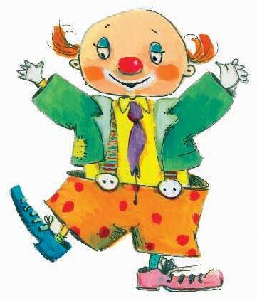 Okrog vratu ima zavezano vijoličasto kravato. Hlače imajo naramnice. Te se spredaj zapenjajo z velikima gumboma. Lica so rdeče napudrana. Oči so črno obrobljene. Velika usta ima narisana z belo barvo.