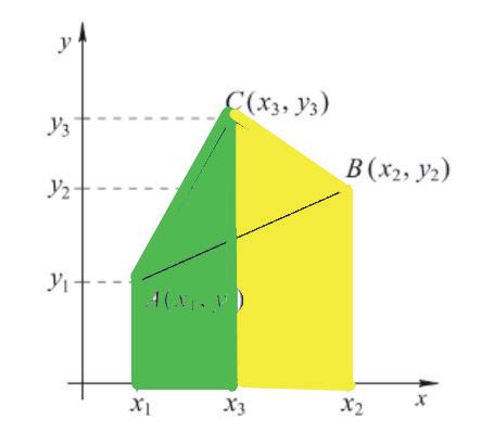 Pri izračunu ploščine bo več dela. Trikotnik ABC bomo vklenili v tri trapeze in z metodo »šivilja in škarjice« dobili iskano število oz. bomo od vsote ploščin zelenega in rumenega trapeza odšteli ploščino modrega trapeza.