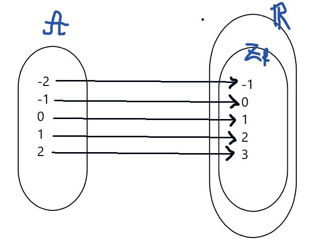 Naj bo A = {–2, –1, 0, 1, 2} in B = ℝ, predpis funkcije pa f(x) = x +1. Predstavimo funkcijo s tabelo in puščičnim diagramom.
