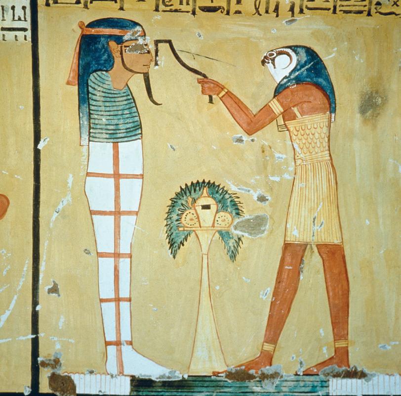 Egipčanski svečenik, ki nosi masko boga Horusa, z obredom mrtvemu obuja čute, da bo lahko zaživel posmrtno življenje.