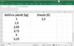 Prikaži zneske za nakup teh jabolk s preglednico, če so stranke kupile 1˙5 kg, 2˙83 kg, 3˙75 kg, 4 kg, 5˙25 kg Odvisnost prikaži tudi z grafom