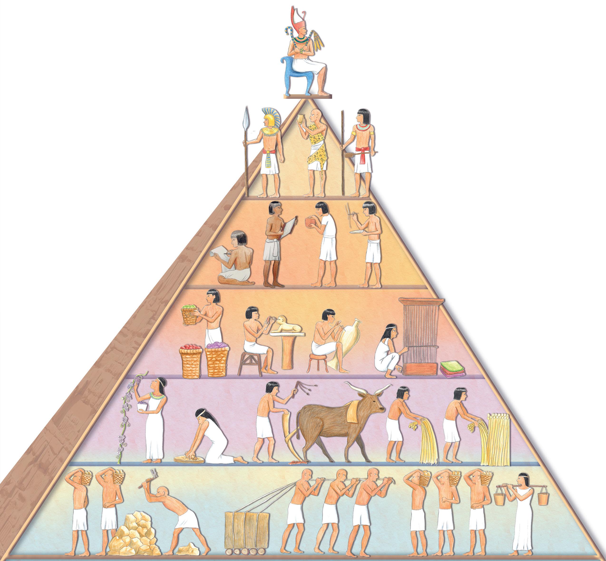 Družba v Egiptu je bila razslojena na več strogo ločenih slojev, ki so se med seboj razlikovale po premoženju, pravicah, vlogi in položaju v družbi. V skupinah na dnu je bila večina ljudi, v skupinah na vrhu pa le malo posameznikov. Takšni družbeni ureditvi pravimo družbena piramida; lahko jo predstavimo v obliki piramide.