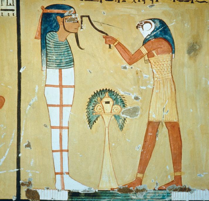 Egipčanski svečenik, ki nosi masko boga Horusa, z obredom mrtvemu obuja čute, da bo lahko zaživel posmrtno življenje.