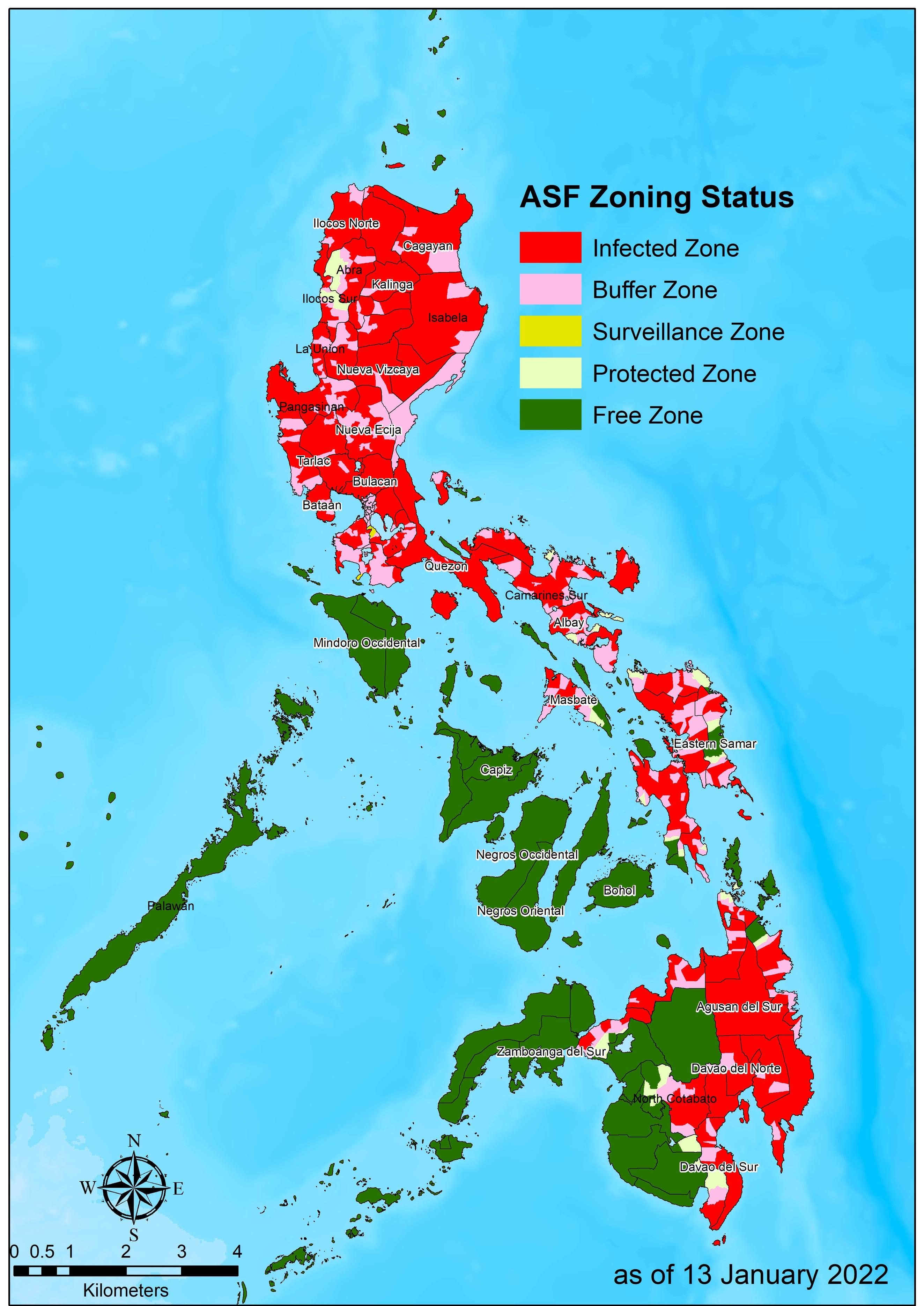 ASF Situationer. A total of 3,554 barangays in 664 cities and municipalities, 51 provinces, and 13 regions had been infected with ASF as of December 2021. To control the spread of the disease, the agency implemented the “1-7-10” protocol. The agency culled some 499,389 hogs in the process. Data from the Bureau of Animal Industry (BAI) show that these operations contained ASF in 43 barangays in 16 municipalities, eight (8) provinces, and four (4) regions by the end of the year.