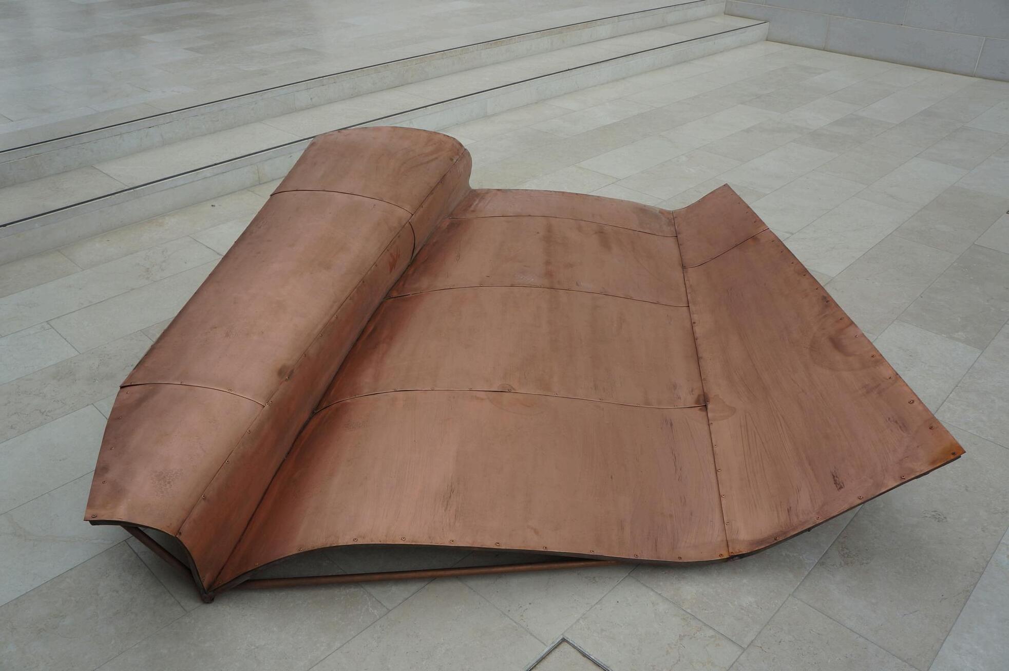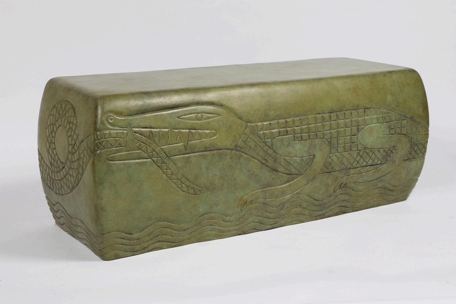 Esta obra tiene la forma de un cocodrilo fundida en sus laterales. Está hecha de bronce, un tipo de metal que se utiliza a menudo para crear esculturas resistentes.