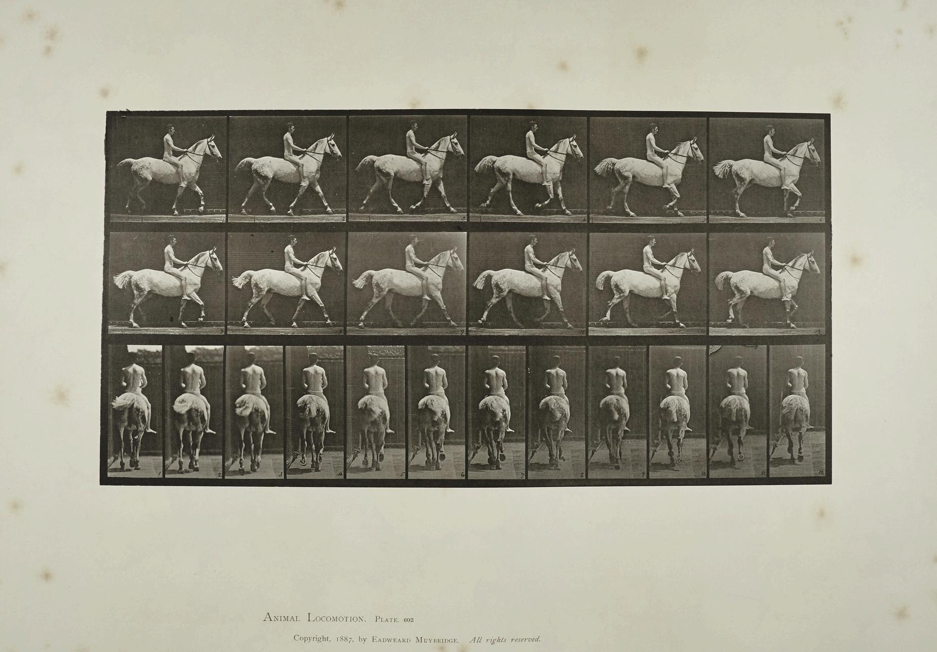 Aquí hay muchas fotografías pequeñas que muestran a un hombre a caballo. Si miras con atención, verás que cada una es un poco diferente. Cuando se colocan justo una al lado de la otra, las fotos crean la ilusión de que el caballo se está moviendo.