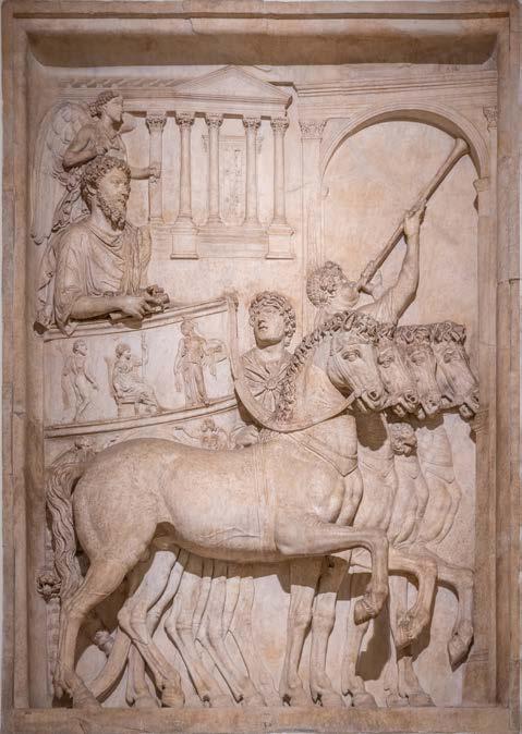 Fig. 3 — Herziene weergave van Marcus Aurelius’ triomftocht, waar Commodus oorspronkelijk naast zijn vader was afgebeeld. Sporen van deze aanpassing zijn zichtbaar aan de tweede zuil van links in de achtergrond, die verder naar voren staat. Anoniem, 177–180 n.Chr., reliëfpaneel, Capitolijnse Musea, Rome.
