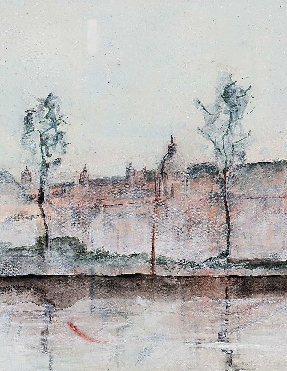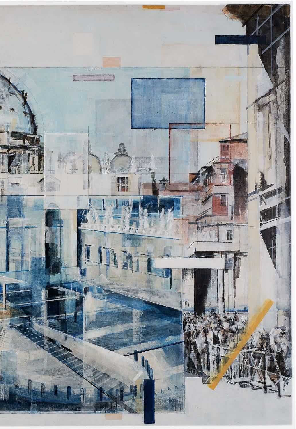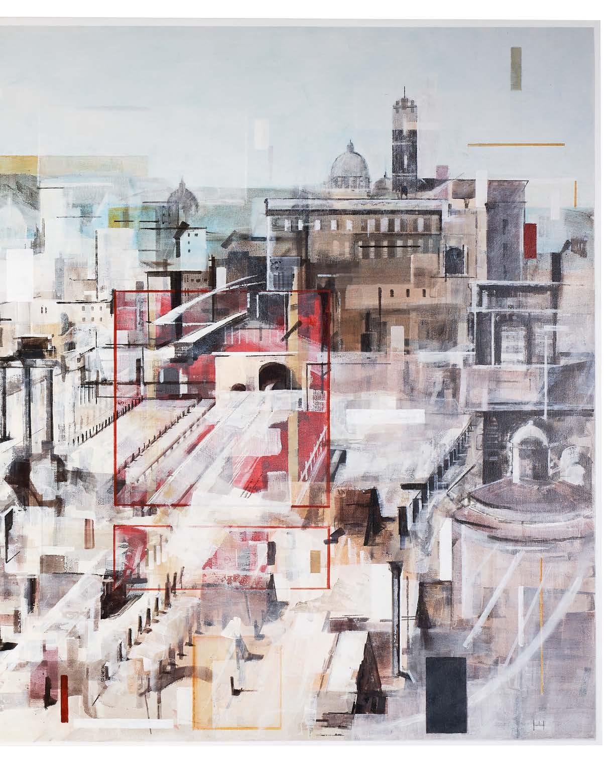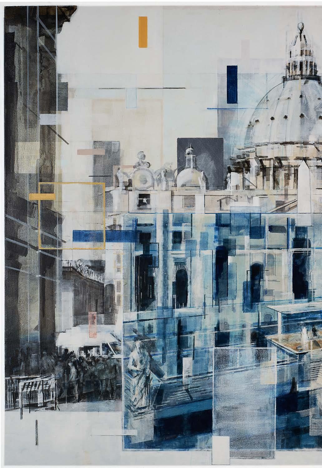 kunstenaar Wessel Huisman. Hij komt al jaren in Rome om, zoals tallozen voor hem, inspiratie op te doen voor zijn schilderkunst. Bij een ontmoeting met Francesco Buranelli, de voormalig algemeen directeur van de Vaticaanse Musea, werd hij aangespoord de stad zelf tot onderwerp van zijn werk te maken. We zijn blij verheugd in de beeldbijdrage van dit nummer een kleine selectie van het resultaat te kunnen tonen. Huismans spel met perspectief en abstractie geeft ons een verrassend frisse blik op het hedendaagse Rome.