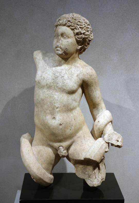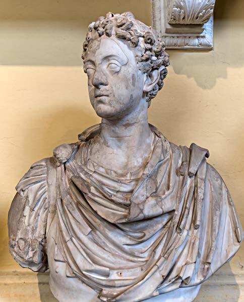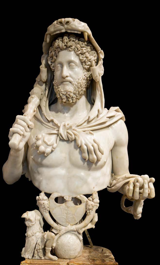 ondergrondse kamers van de Horti Lamiani, de tuinen van Lamia gelegen op de Esquilijn, waar hij tijdens Commodus’ regeerperiode ook tentoongesteld werd.16 In dit beroemde kunstwerk is Commodus’ torso naakt afgebeeld, met alleen de leeuwenhuid van Hercules over zijn hoofd en de leeuwenpoten geknoopt voor zijn borst. In zijn rechterhand houdt hij de knots van Hercules vast en in zijn linkerhand de gouden appels van de Hesperiden, die Hercules onsterfelijkheid gaven. Oorspronkelijk was de buste onderdeel van een grotere beeldengroep, waar Commodus geflankeerd werd door twee tritons die een doek over zijn hoofd hielden, gereconstrueerd op basis van vergelijkbare hofkunst uit de Antonijnse periode. Dit doek was hoogstwaarschijnlijk een parapetasma, dat op sarcofagen over het hoofd van overledenen werd gehouden.17 Door zichzelf op deze wijze af te beelden verkondigde Commodus dat hij onsterfelijk was.