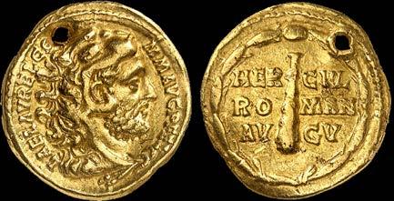 Fig. 5 — Aureus van Commodus. Voorzijde: portret van Commodus met Hercules’ leeuwenhuid. Keerzijde: Hercules’ knots, met de inscriptie HERCVL ROMAN AVGV. 191–192 n.Chr., Rome, goud.