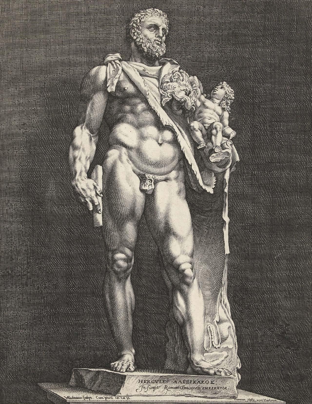 Fig. 1 — Hendrick Goltzius, Naar het klassieke beeld dat Commodus als Hercules zou betreffen. 1590–1594, gravure, 41 × 29 cm, Rijksmuseum, Amsterdam.