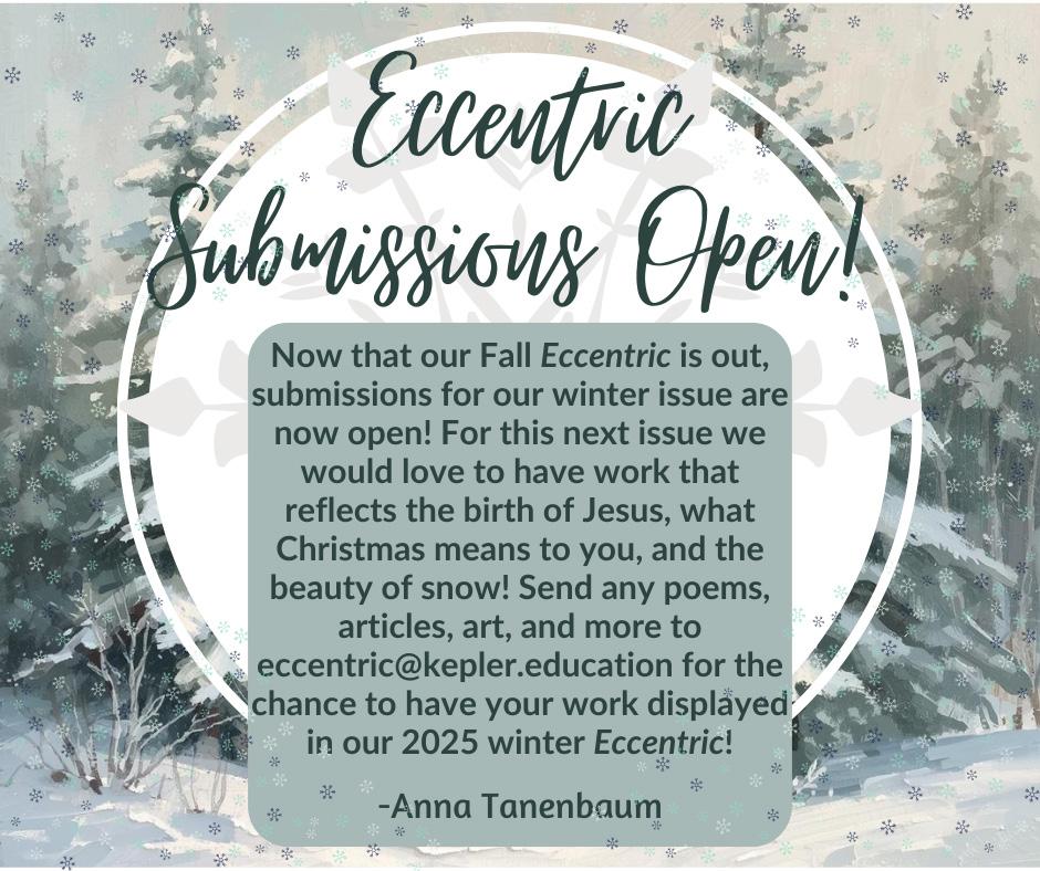 At Kepler, we know that there is more to life than just academics, as important as they are. In this edition of The Eccentric, you will see evidence of the wide range of pursuits of our students: short stories, poetry, photography, recipes, and more! May you glimpse a small portion of God’s Fall-Glory in this issue, and thanks for reading!