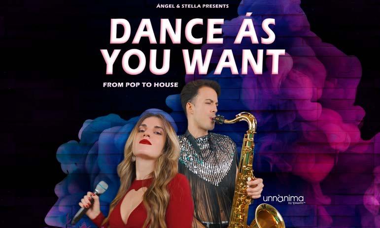 Dance ÁS You Want! Ibiza en estado puro. Los grandes éxitos del Pop y del House sonarán en este espectáculo haciendo vibrar a cualquiera. DJ set con dos voces en vivo y un saxofón echando fuego. Sea de día o de noche, Ángel Cobo y Stella Maiques os invitarán a bailar y cantar como si estuvierais en Ibiza. Este dúo tocará canciones de Calvin Harris, Dua Lipa, Rihanna, David Guetta, Bruno Mars y muchos más. ¡Es la hora de bailar como quieras!