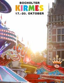 Vier dagen lang buitengewoon veel plezier in Bocholt met de grootste kermis van Westmünsterland. Meer dan 300 kermisexploitanten zorgen vier dagen lang voor een hoogtepunt voor jong en oud. Altijd in het derde weekend van oktober! www.kermisinbocholt.nl