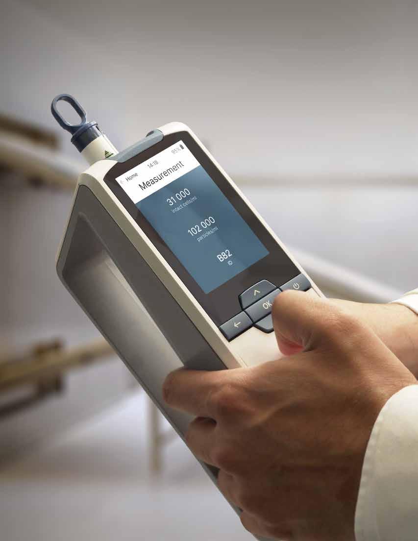 Wie bereits erwähnt, liegt ein Vorteil von Impedanz-Durchflusszytometern gegenüber anderen Arten von zytometrischen Geräten in ihrer Tragbarkeit. Da sie leicht, klein und batteriebetrieben sind, können sie vor Ort und an kritischen Kontrollpunkten, an denen Hygiene besonders wichtig ist, eingesetzt werden. Das Impedanz-Durchflusszytometer CytoQuant® ist für den Einsatz in genau solchen Bereichen, einschließlich Lebensmittelproduktionsanlagen und Reinräumen, konzipiert. Die Impedanz-Durchflusszytometrie bietet Lebensmittelherstellern, die ihre Programme zur Lebensmittelsicherheit und -reinigung überprüfen wollen, beträchtliche Vorteile: die schnelle und separate Quantifizierung von Bakterien und Partikeln (die als Indikator für die Reinigungsund Desinfektionseffizienz dienen können), die Empfindlichkeit der Methode und die Robustheit des Tupferkits und des Zytometers selbst.