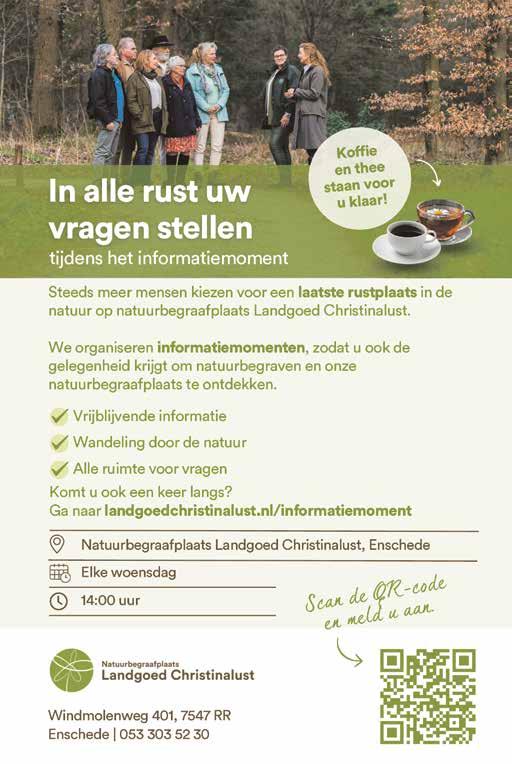 De informatiemomenten vinden iedere week plaats op vaste dagen en tijden. Deelname is gratis en aanmelden is niet nodig. Meer informatie over dagen en locaties is te vinden via de website van Crematoria Twente: www. crematoriatwente.nl .
