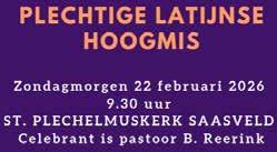 Celebrant pastor Willy Rekveld. Acoliet en Lector: Jos Westendorp. Koster: Tine Westendorp; Camera: Gerrit Menkehorst. De intenties van afgelopen zaterdag worden ook in deze H. Mis gelezen. Na afloop koffiedrinken in de pastorie. Aangezien de Aswoensdag viering is komen te vervallen is tijdens deze viering ook uitdeling van het Askruisje.