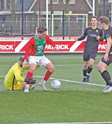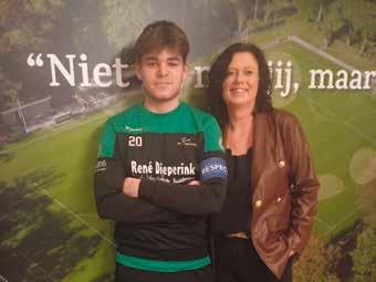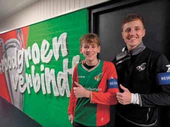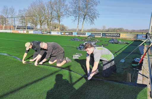 er ook feest in de kantine met muziek. De kunstgrasmat bij Hoeve Vooruit was na bijna vijftien jaar aan vervanging toe. “Dat was onze eerste kunstgrasveld”, zegt Ter Braak. Het nieuwe kunstgrasveld wordt aangelegd door het bedrijf Rolugro uit Groenlo. “Wij leggen ongeveer dertig kunstgrasvelden per jaar aan. Dat doen we ook veel in Duitsland”, zegt Nick Oude Luttikhuis (rechts) van Rolugro. Na het verwijderen van de oude mat is eerder deze week een begin gemaakt met de aanleg van de nieuwe mat. Grote rollen werden uitgerold op de ondergrond. Hoeve Vooruit kan tijdens het seizoen dus enkele weken niet op het eigen hoofdveld voetballen, Daarom is het thuisduel afgelopen zondag tegen Rood Zwart bij Rood Zwart in Delden gespeeld. Uitslag 0-0.
