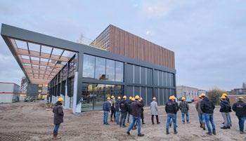 De projectleider van Heddes Bouw & Ontwikkeling verzorgt een rondleiding door de hal van het CAB waar de imponerende V-kolommen oprijzen, door het opengelegde dak heen. Op de bouwstelling boven het dak van de oudbouw is te zien hoe de eerste kanaalplaatvloeren op de robuuste draagconstructie van de nieuwbouw zijn gelegd. Kranen zie je bewegen boven drie