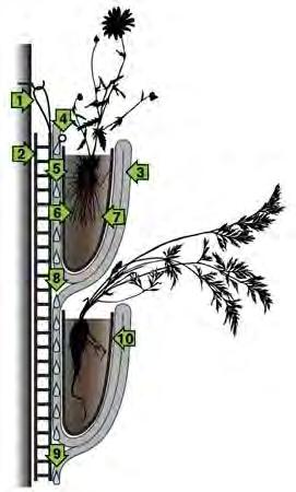 The green wall system utilizes the geotropism of plants to ensure the survival and growth of plants by providing space for the roots of plants.