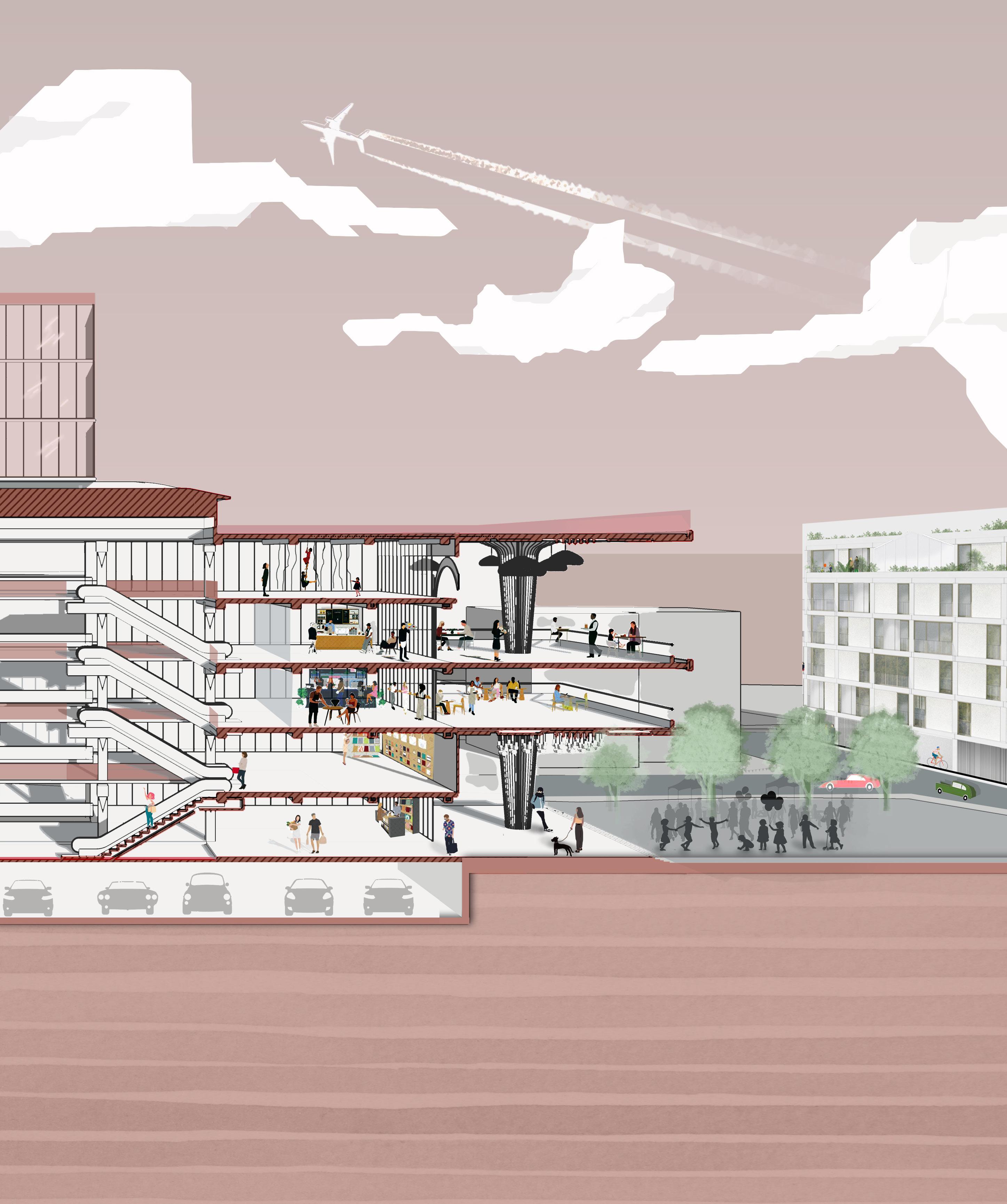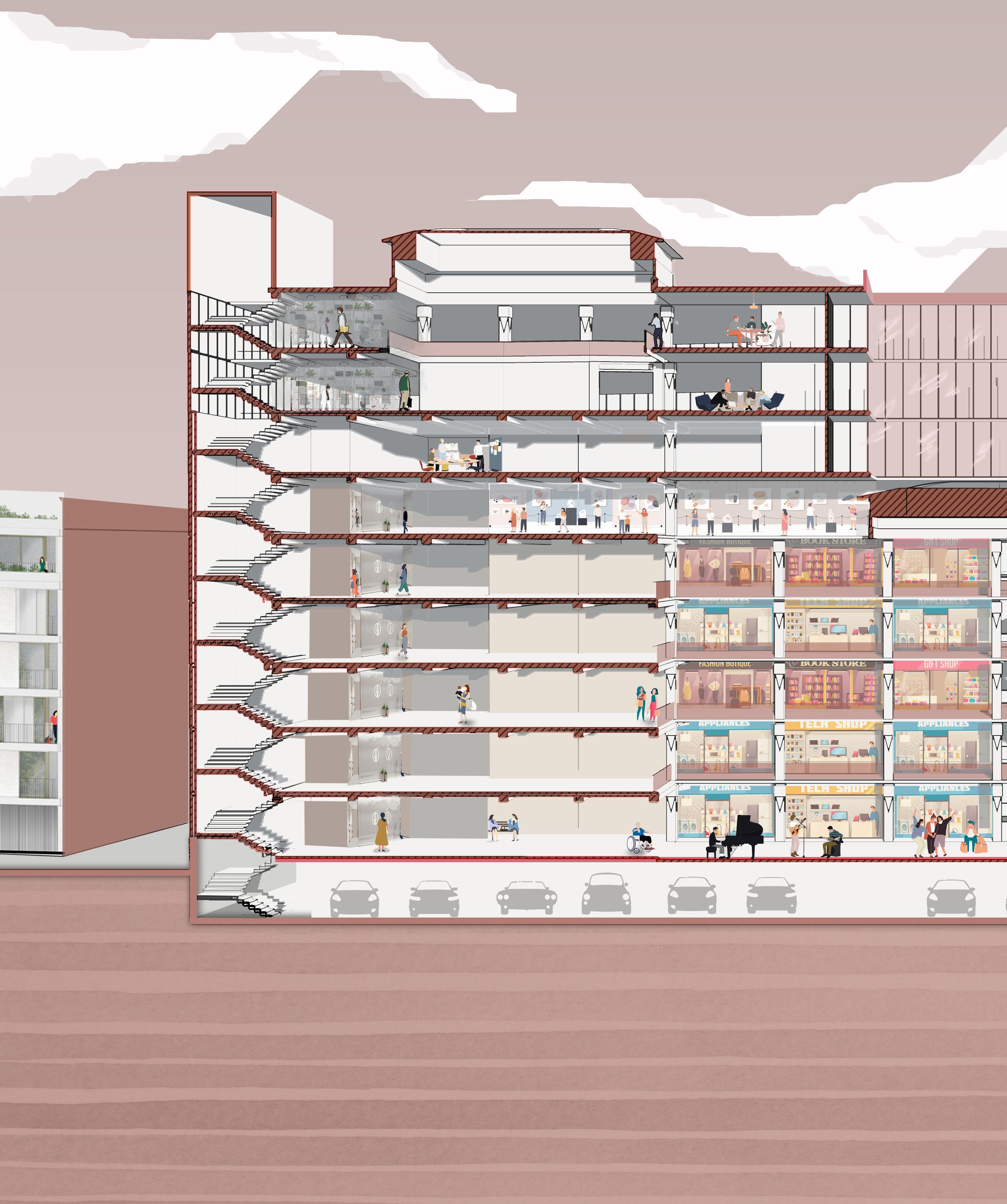 The section drawing reveals a well-organized layout and ample parking space is provided shops and tech stores designed to attract foot traffice, Above the retail floors, the building ty and collaboration, with open-plan layouts, The upper levels towards the junction facade