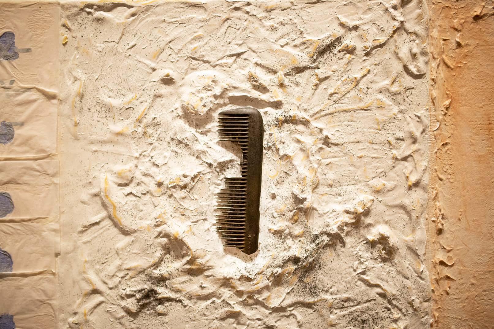 Acrylic, vinyl, graphite, putty, unfired stoneware, rolling papers, comb (with stones) found in Darby Creek, found photo, glue on canvas 10 x 30 x 0.75 in.
